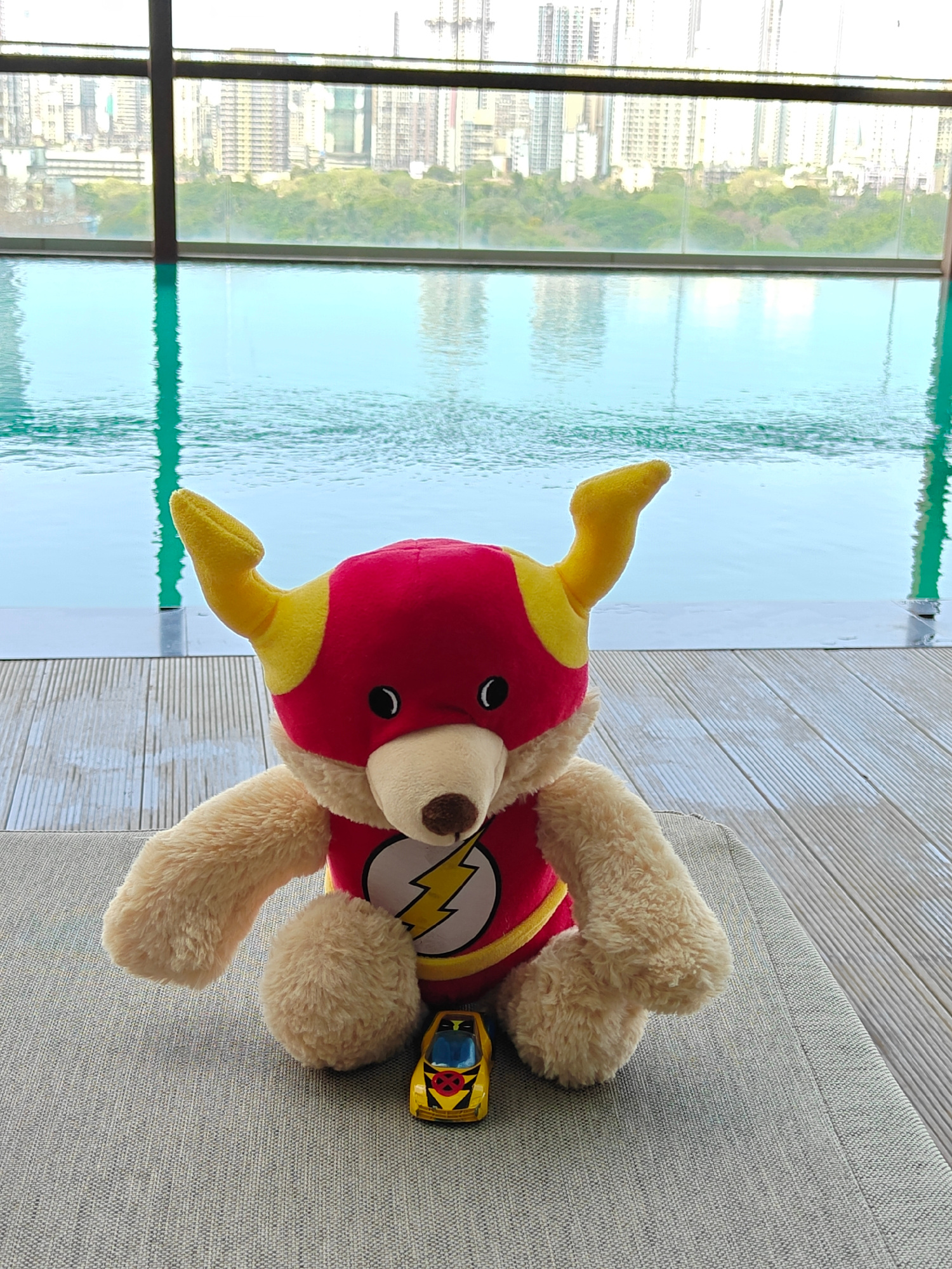 A stuffed toy bear dressed as The Flash sits on a gray textured surface. Adjacent to the bear is a small yellow toy car. Behind the bear, through a large window, is a swimming pool with the city of Muβ¦read more