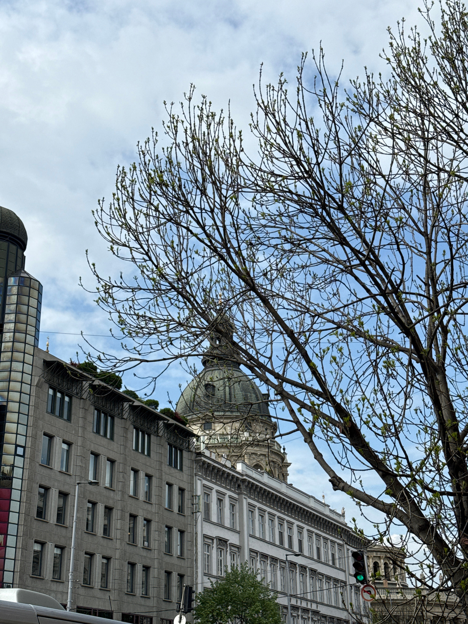 The image depicts an upward view of buildings in Budapest, Hungary, partially obscured by tree branches with budding leaves. The buildings are varied in architectural style, ranging from classical wit…read more