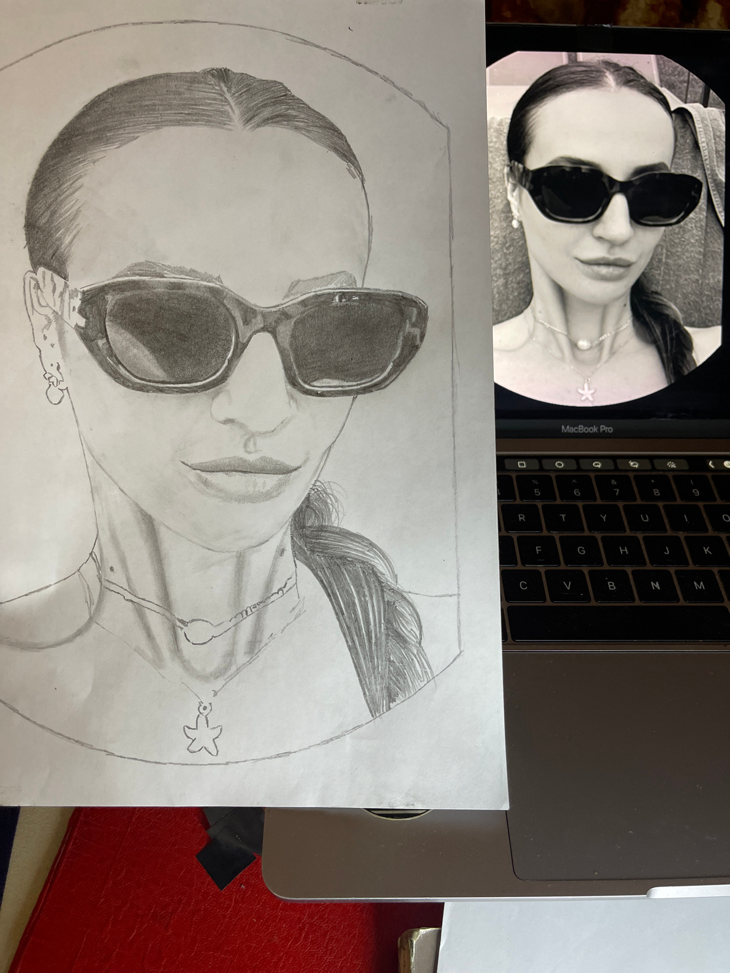The image displays a pencil drawing of a woman wearing sunglasses, alongside the photograph it is based on, both placed on top of a partially visible laptop. The drawing is a sketch, with shading and…read more