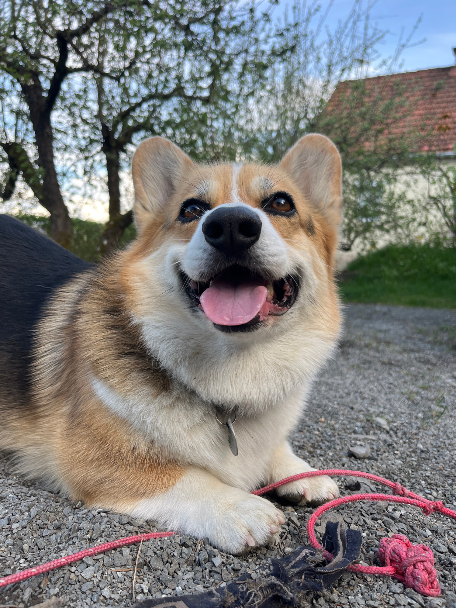 This image, captured in Gangloff, Germany, features a cheerful tri-color Pembroke Welsh Corgi dog. The dog is positioned on a gravel path, viewed from a low angle, with its head tilted and looking dir…read more