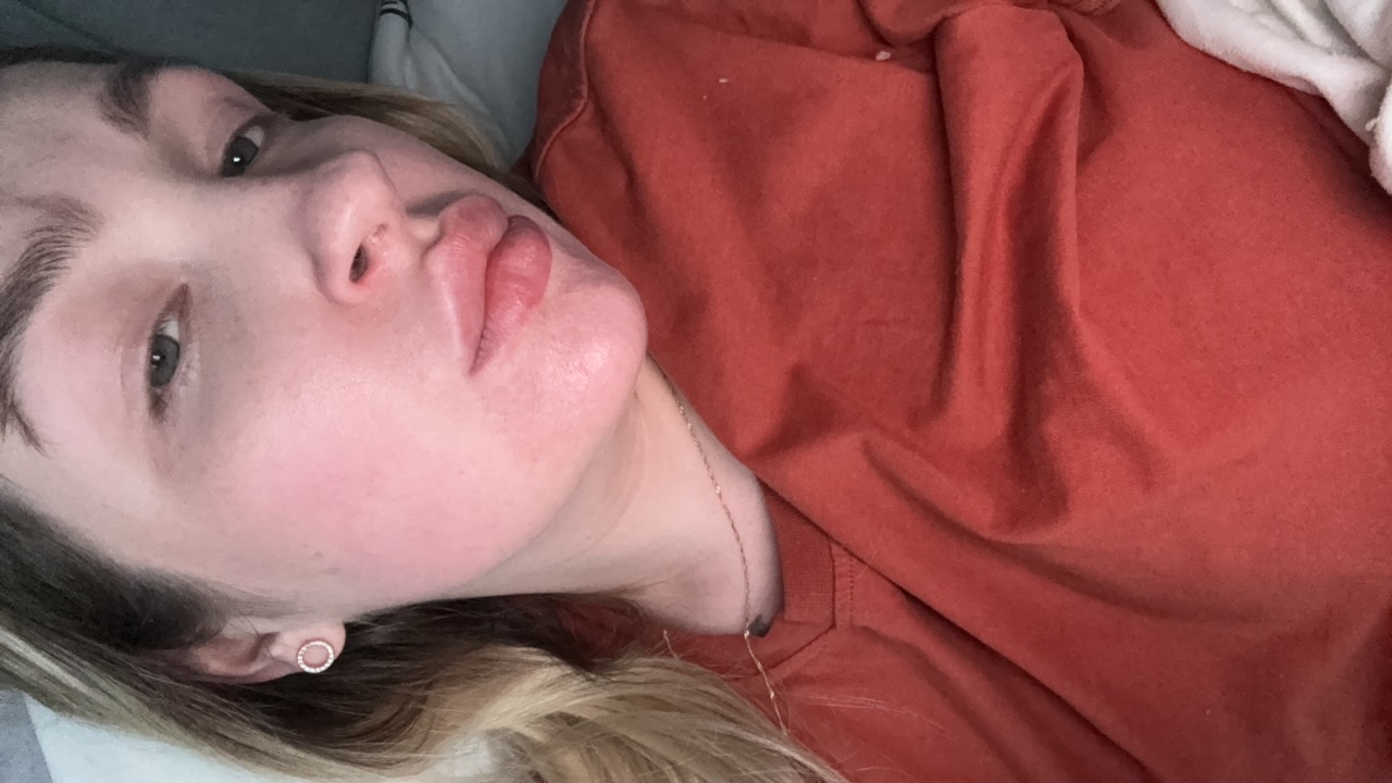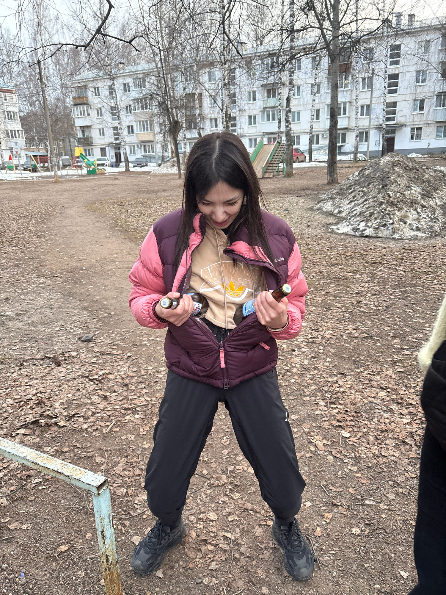 The image shows a young woman outdoors, holding two bottles of what appears to be beer. She is standing on a ground covered with dry leaves and small twigs. She is wearing a pink and maroon jacket, a…read more