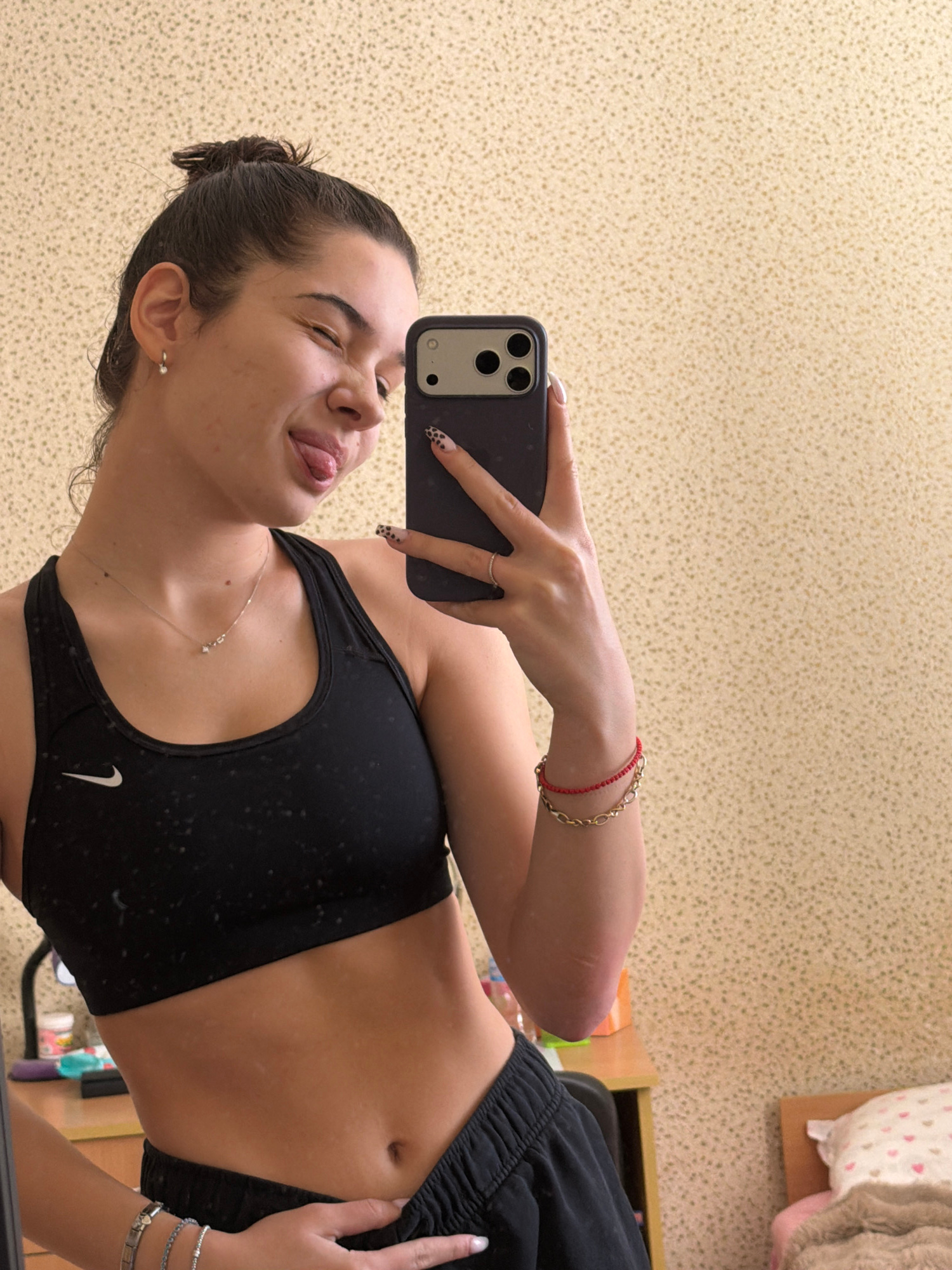A young woman takes a selfie with her mobile phone. She is wearing a black sports bra and black sweatpants. The background appears to be a room with patterned wallpaper. The image provides no informat…read more
