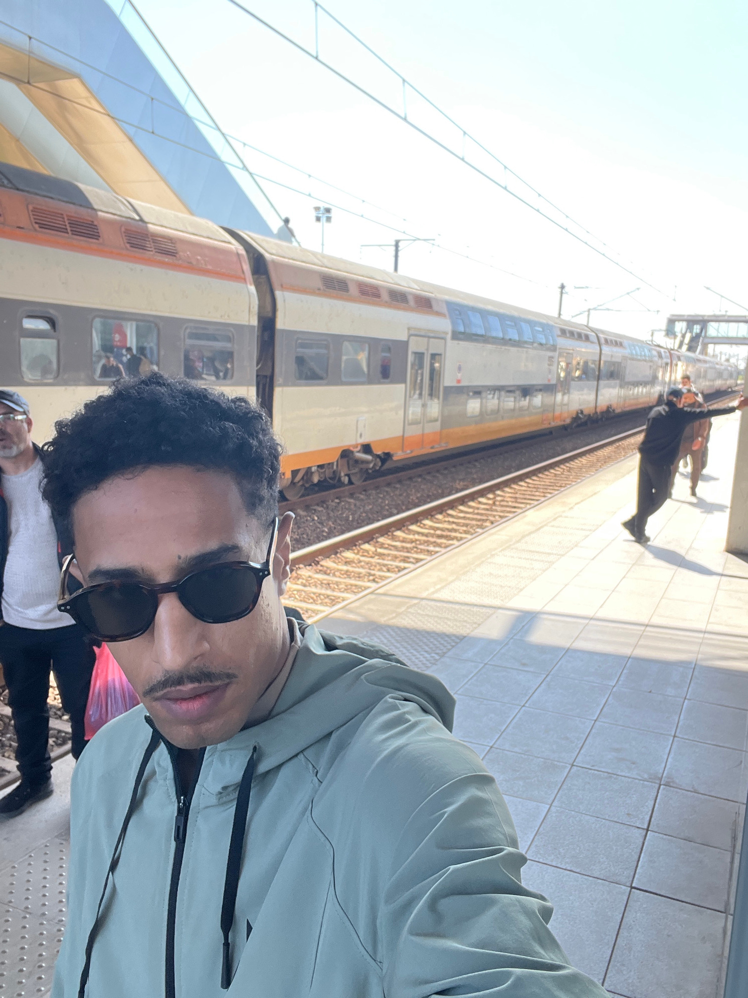 An individual with dark, curly hair and a mustache, wearing dark sunglasses and a light green hooded zip-up jacket, occupies the foreground, appearing to capture a selfie. To the left and slightly beh…read more