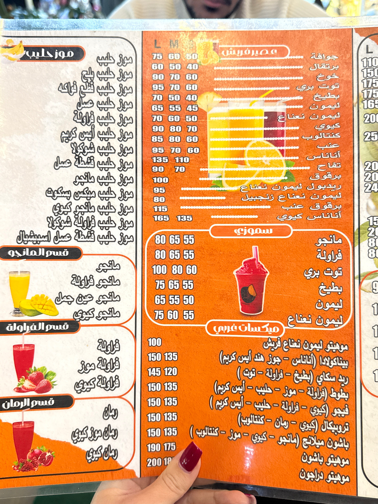 A close-up shot of a menu from a juice shop, likely in New Damietta, Egypt. The menu, printed in Arabic, is sectioned into categories like "Milkshakes," "Mango Section," "Strawberry Section," "Pomegra…read more