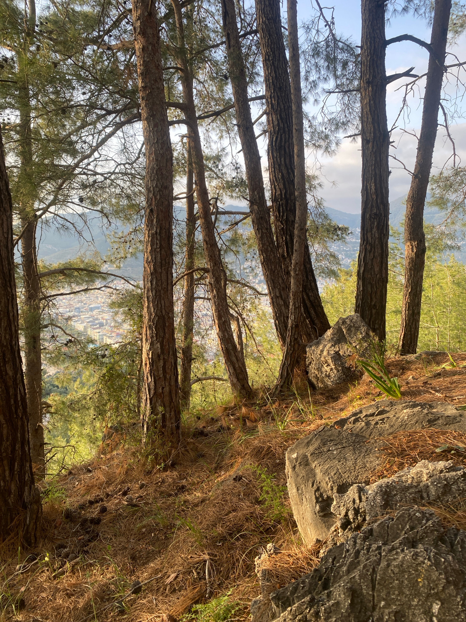 The image depicts a forest scene in Alanya, Turkey. Several pine trees stand upright, their trunks appearing in the foreground and background. The camera angle looks upwards through the tree branches. Beyond the trees, a distant view of the city of Alanya can be seen. To the right, there is a rocky cliff covered in dry pine needles. Some green vegetation grows on the cliff. The sky is partially visible through the tree branches. The image is taken during the daytime. | Open Wire