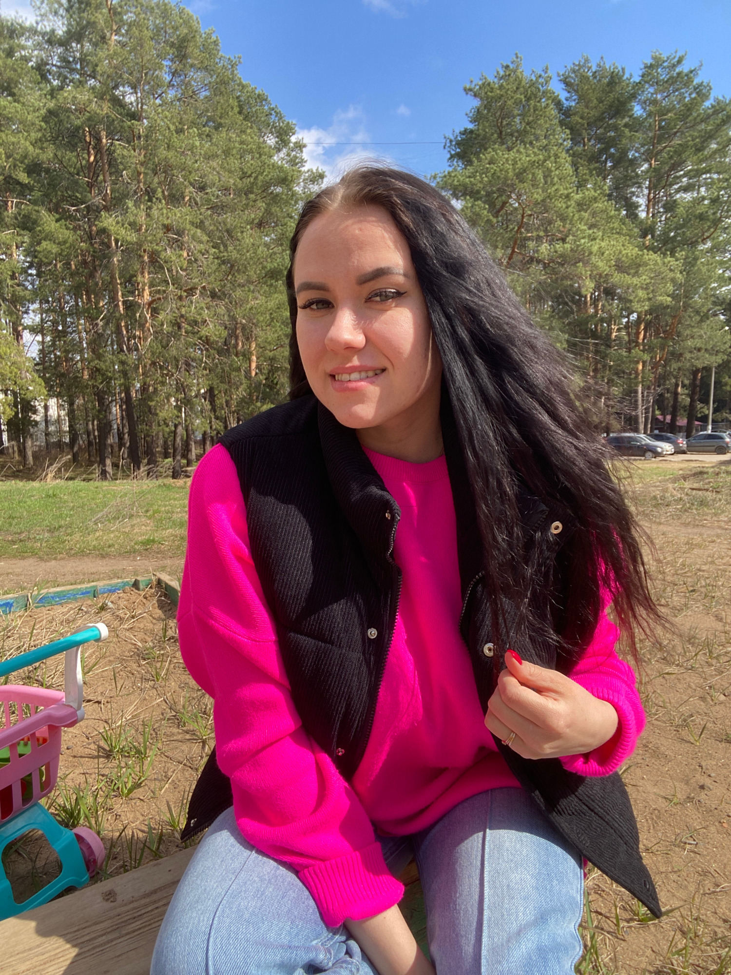 This image, taken in Chaikovsky, Russia, captures a young woman smiling and looking directly at the camera while outdoors. She has long, dark hair and is wearing a vibrant fuchsia pink long-sleeved sw…read more