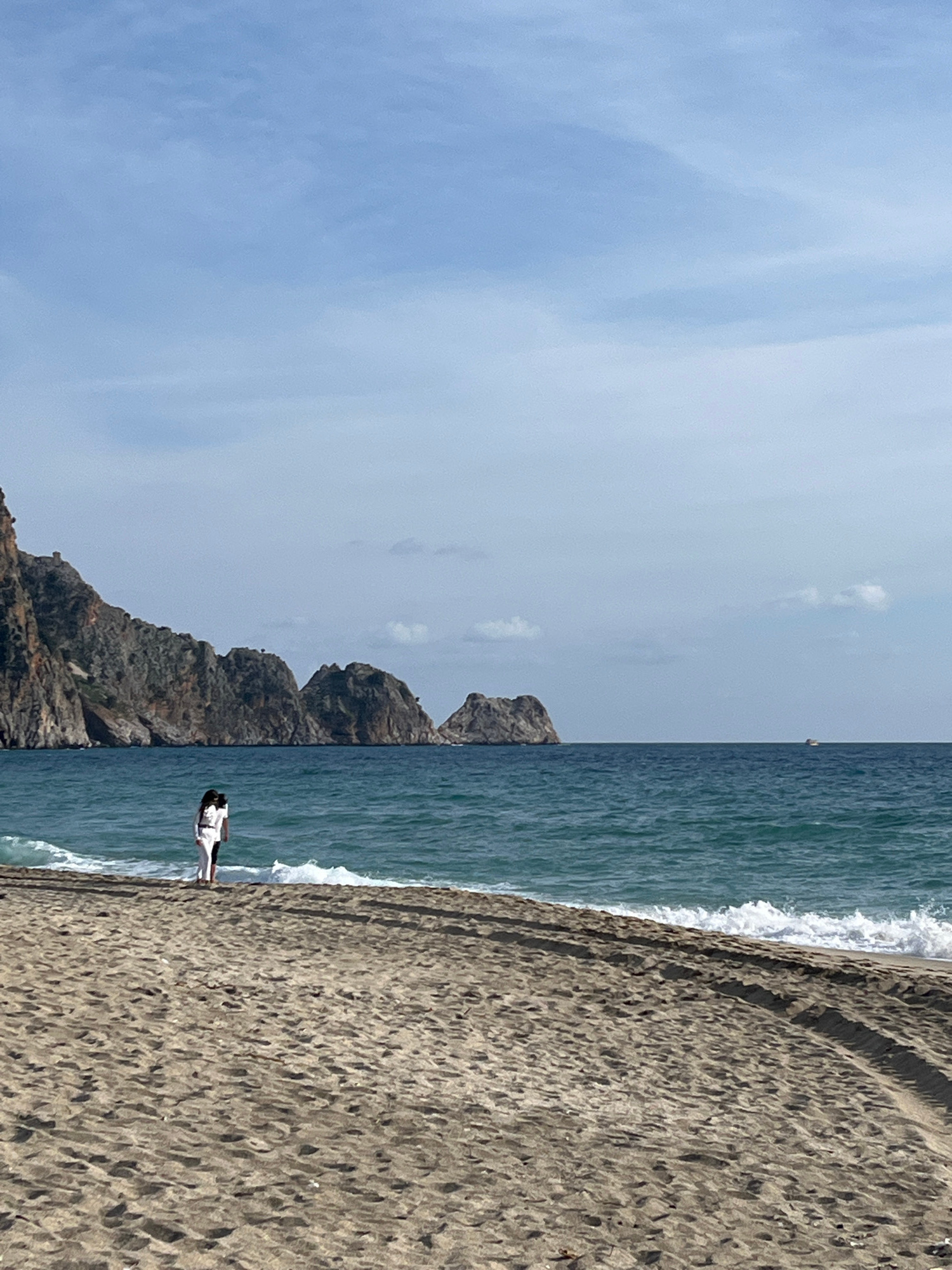 The image displays a coastal scene in Alanya, Turkey, likely from Cleopatra Beach or Damlataş Beach, looking towards the Alanya peninsula. The foreground consists of tan sand featuring visible footpri…read more