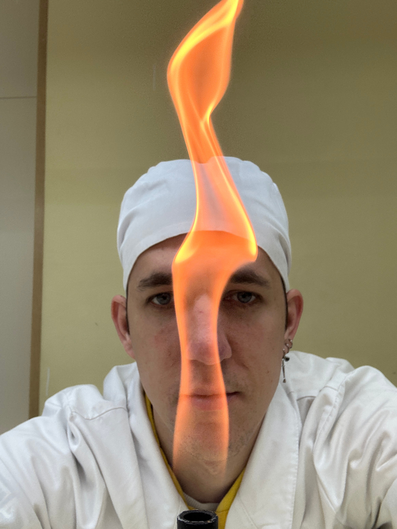 A person wearing a white surgical cap and jacket, possibly a medical professional, is holding a lit blowtorch. The person's face is partially obscured by the flame. The location is not identifiable.
