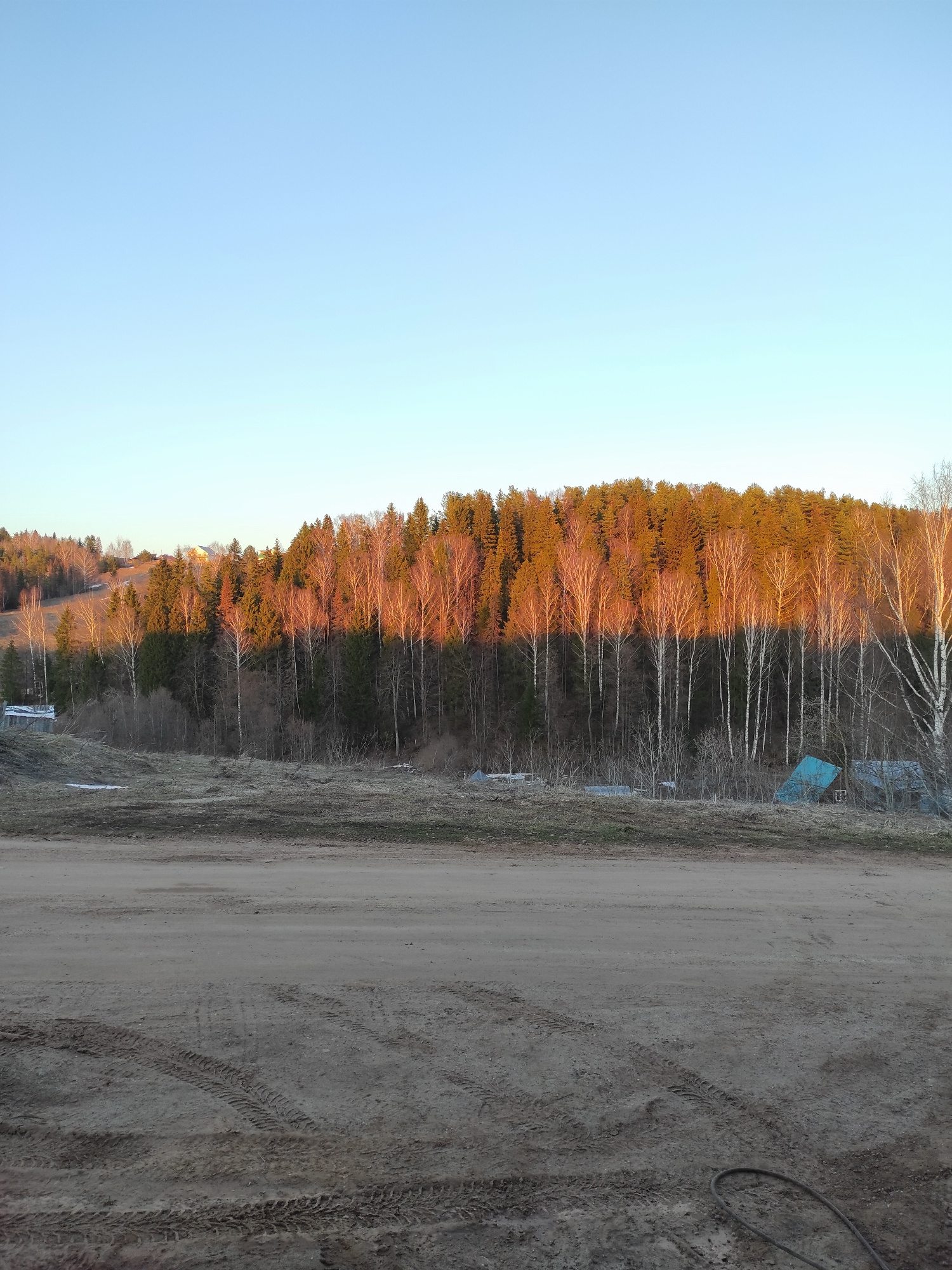 The image depicts a rural scene in Ольховка, Russia. On the left, the sky is a pale blue. Adjacent to the sky is a dense forest with trees displaying golden-orange leaves, potentially indicating the s…read more