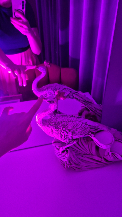 A close-up shot bathed in vibrant purple light showcases a snake with patterned skin. The snake's head is in focus, near a fingertip extending towards it. A person is holding a phone. In the backgroun…read more