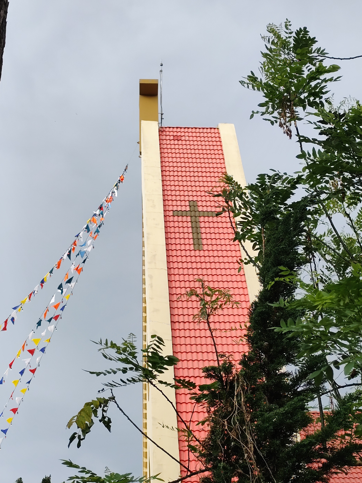 A low-angle shot shows a church steeple and trees against a cloudy sky. The steeple is a rectangular tower with a cross-shaped shadow in the center. The tower is a pale yellow on either side and light…read more