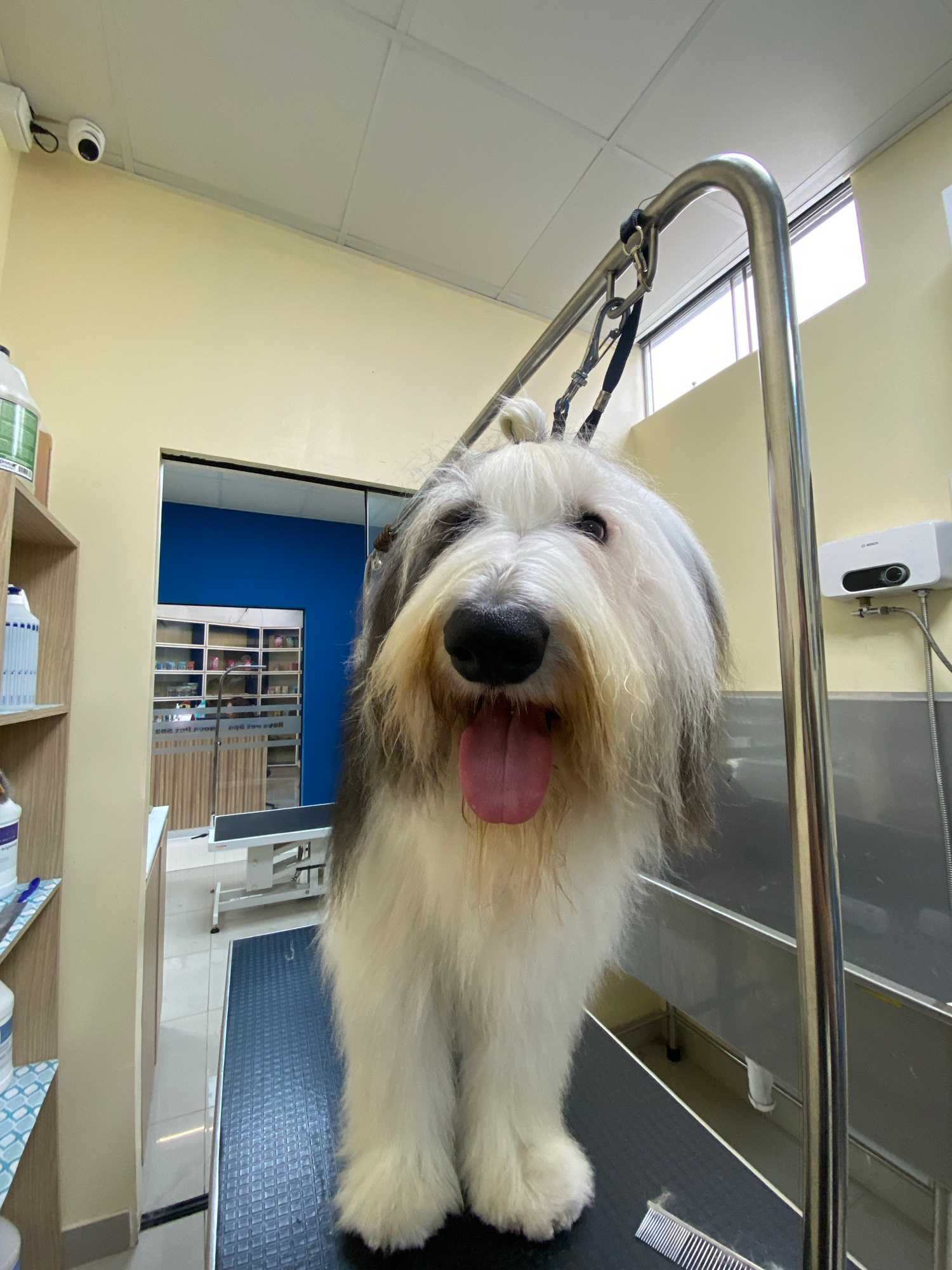 The image shows an Old English Sheepdog panting on a grooming table with a restraint bar above. The dog is white and gray with a black nose and pink tongue. A metal comb is visible on the table next t…read more
