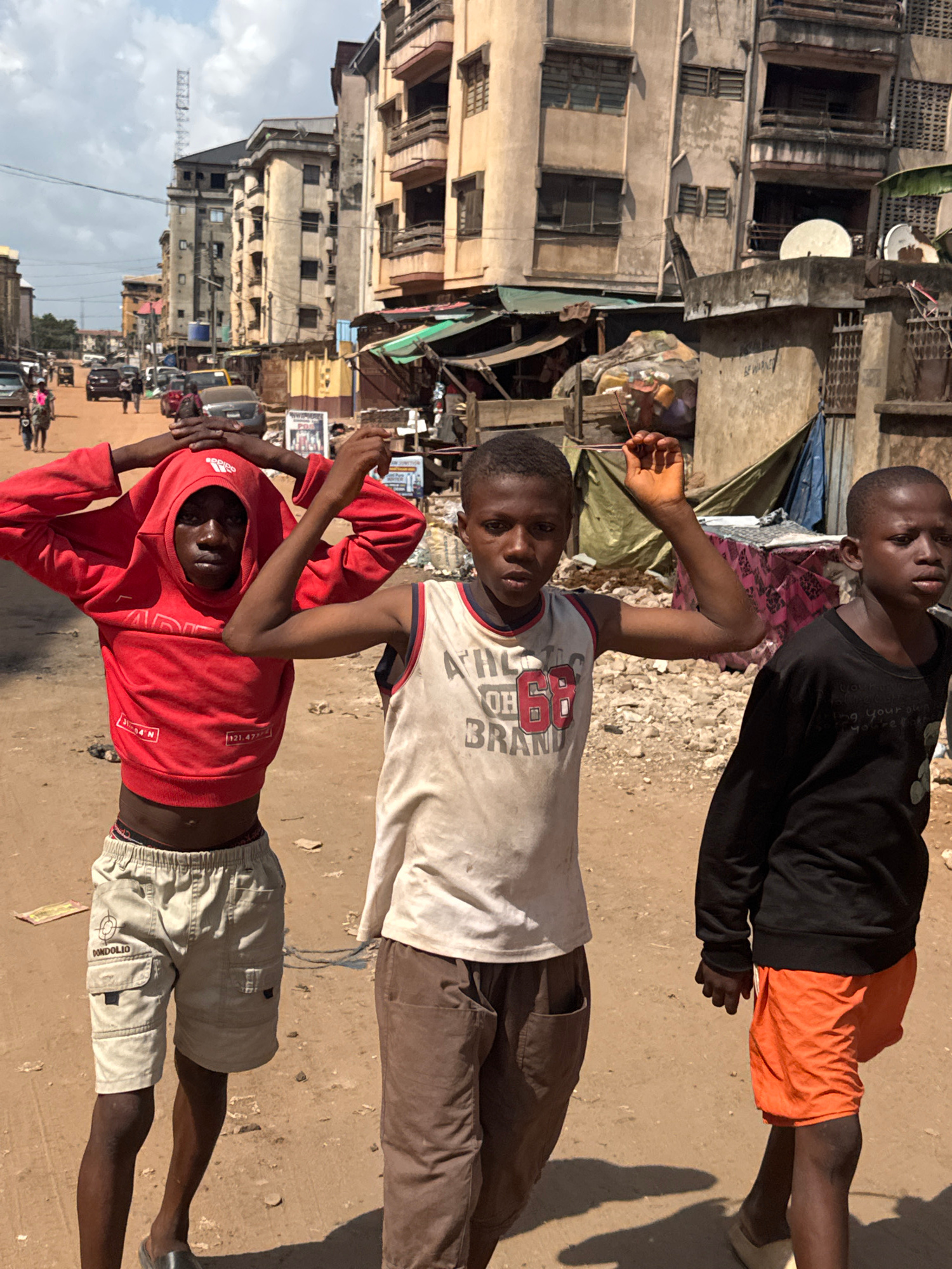 This image captures a bright daylight scene on a dusty street in Onitsha, Nigeria, featuring three young males in the foreground. The overall setting appears to be a bustling urban environment with wo…read more