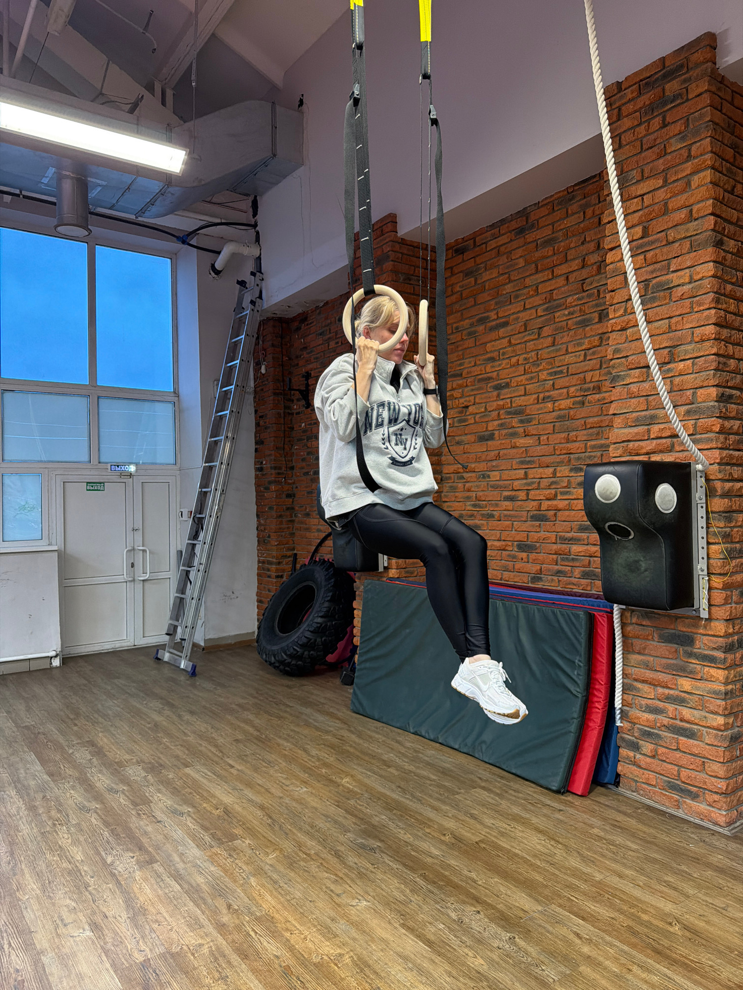 The image shows a woman exercising in a gym. She is suspended from gymnastic rings. She is wearing black leggings, a grey sweatshirt, and white sneakers. Behind her are brick walls, a tire, and mats.…read more