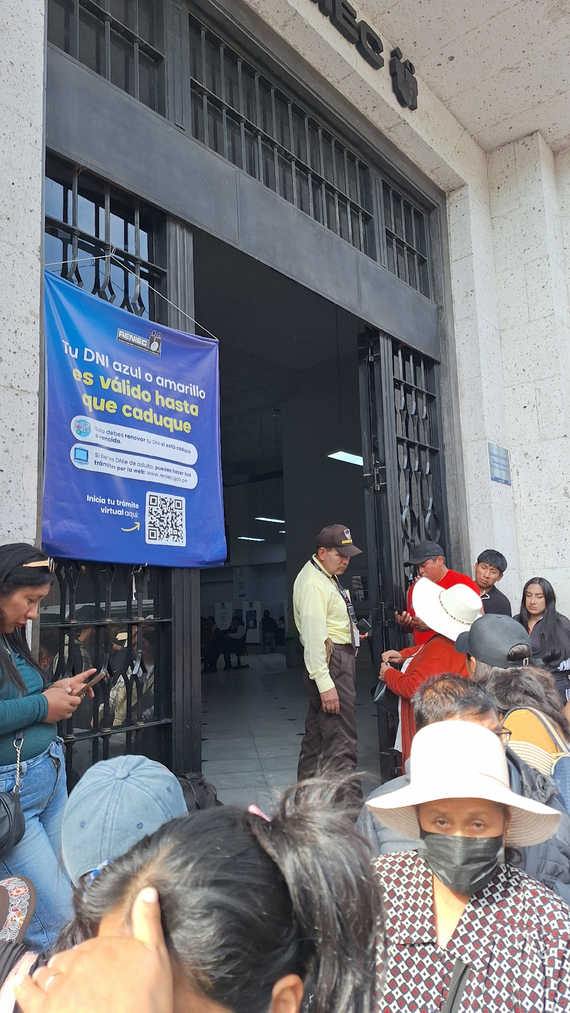 The scene captured is an outdoor image, apparently in front of a RENIEC (Registro Nacional de Identificación y Estado Civil) office, possibly located in Arequipa, Peru. A blue banner reads "Tu DNI azu…read more