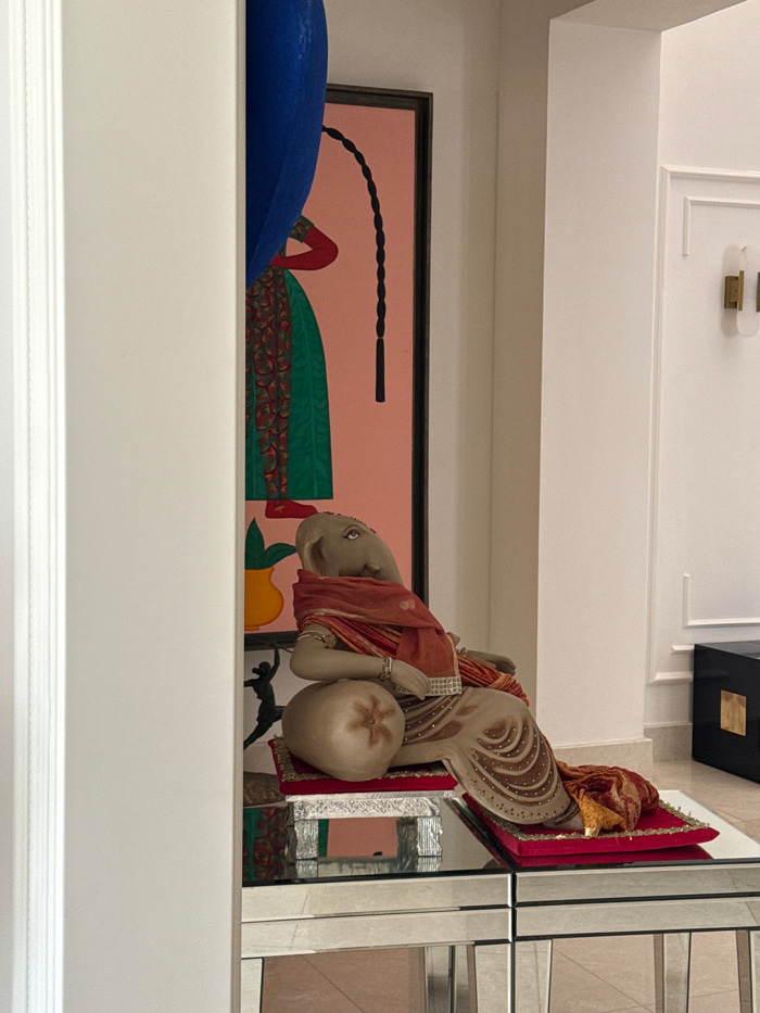 An interior scene in Dubai, United Arab Emirates, displays a light-colored statue of the deity Ganesha in a reclining pose, draped with an orange-red patterned shawl and wearing bangles. The statue re…read more