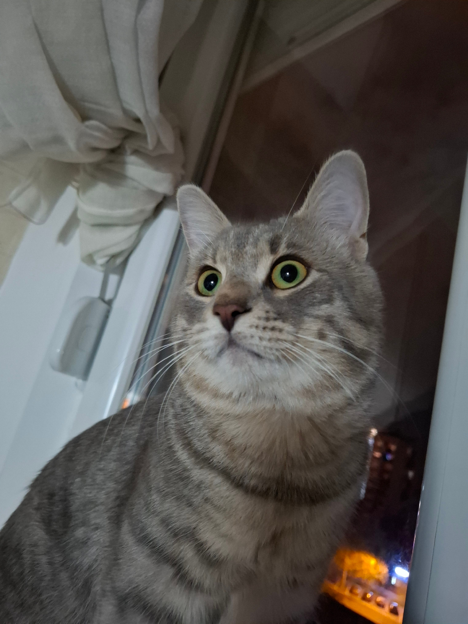 A close-up, high-angle shot captures a grey and white tabby cat looking directly at the camera with wide, luminous green eyes. The cat's head is tilted, giving it an attentive and curious expression,…read more