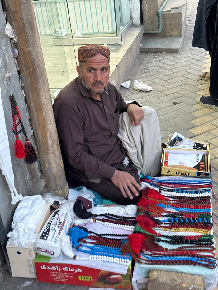 An adult male is seated on a paved sidewalk in Quetta City Tehsil, Pakistan, leaning against a textured, light brown vertical pole. He wears a dark brown long-sleeved shirt, light-colored loose trouse…read more