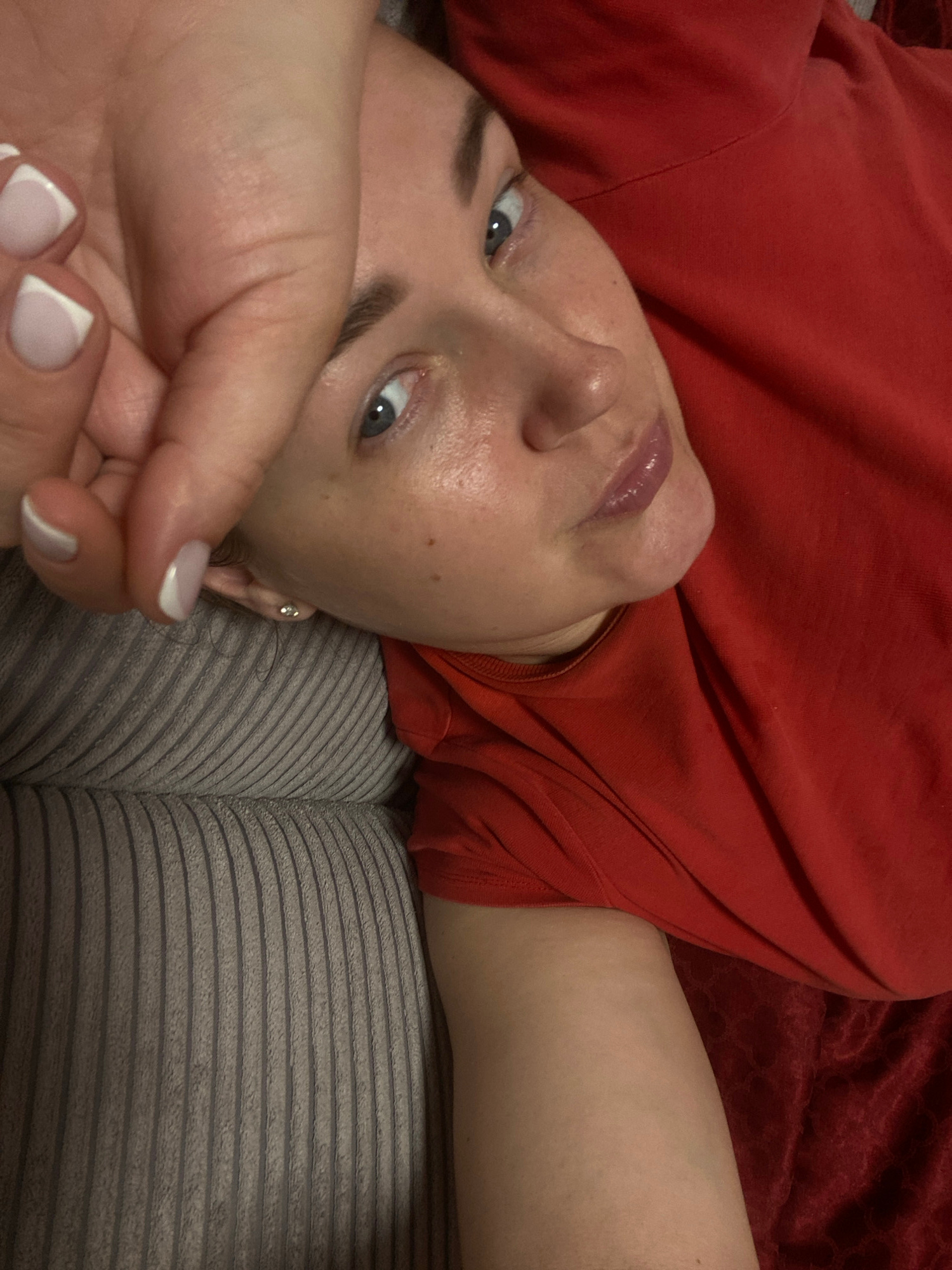 A woman with fair skin and light blue eyes lies on a gray striped textured surface, possibly a couch or bed, with her head tilted towards the camera. She wears a bright red top. Her left hand is raise…read more