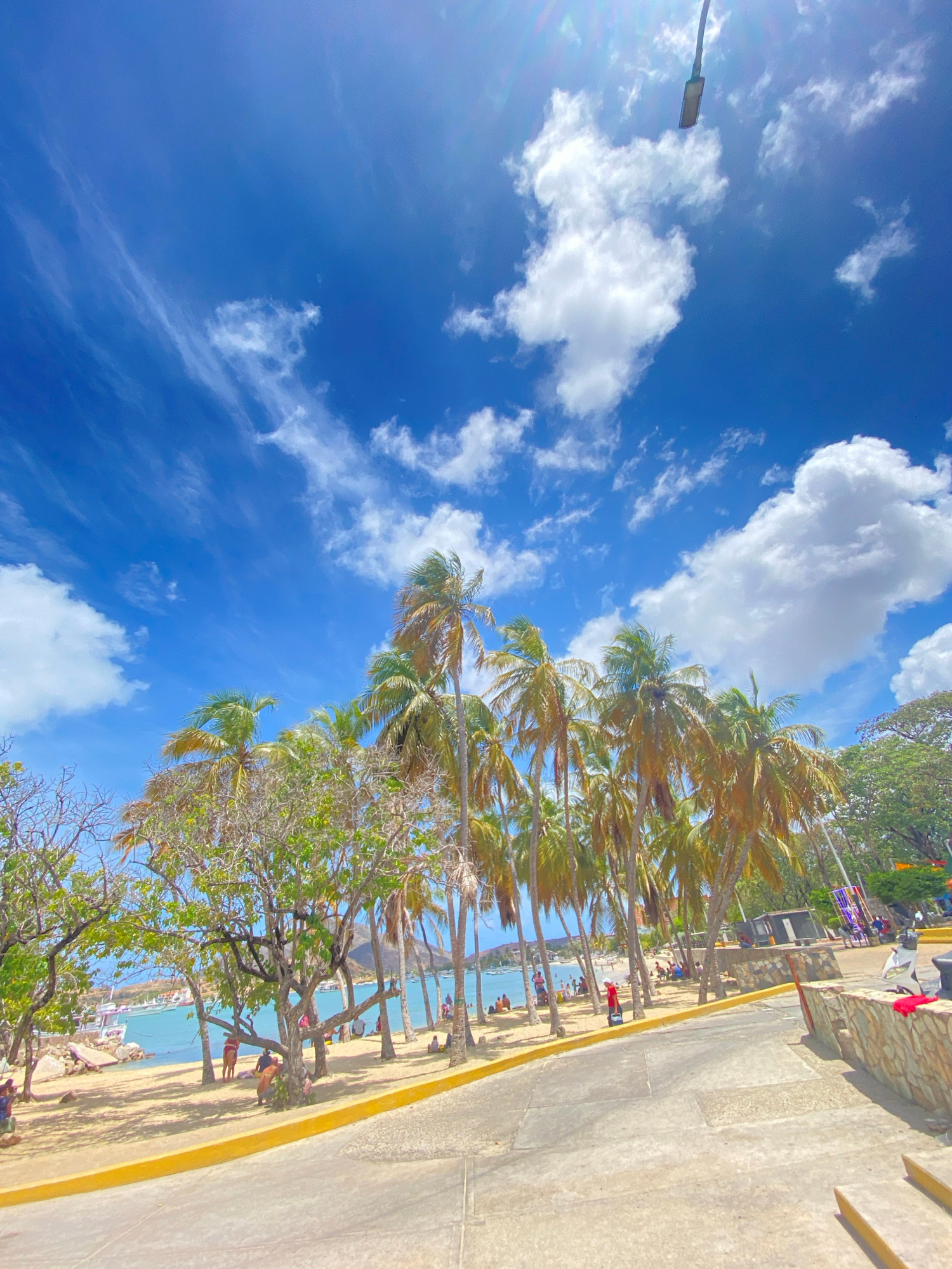 The image depicts a coastal scene in Juan Griego, Venezuela, characterized by a bright blue sky with scattered white clouds. A row of palm trees lines a beach where people are engaging in various acti…read more