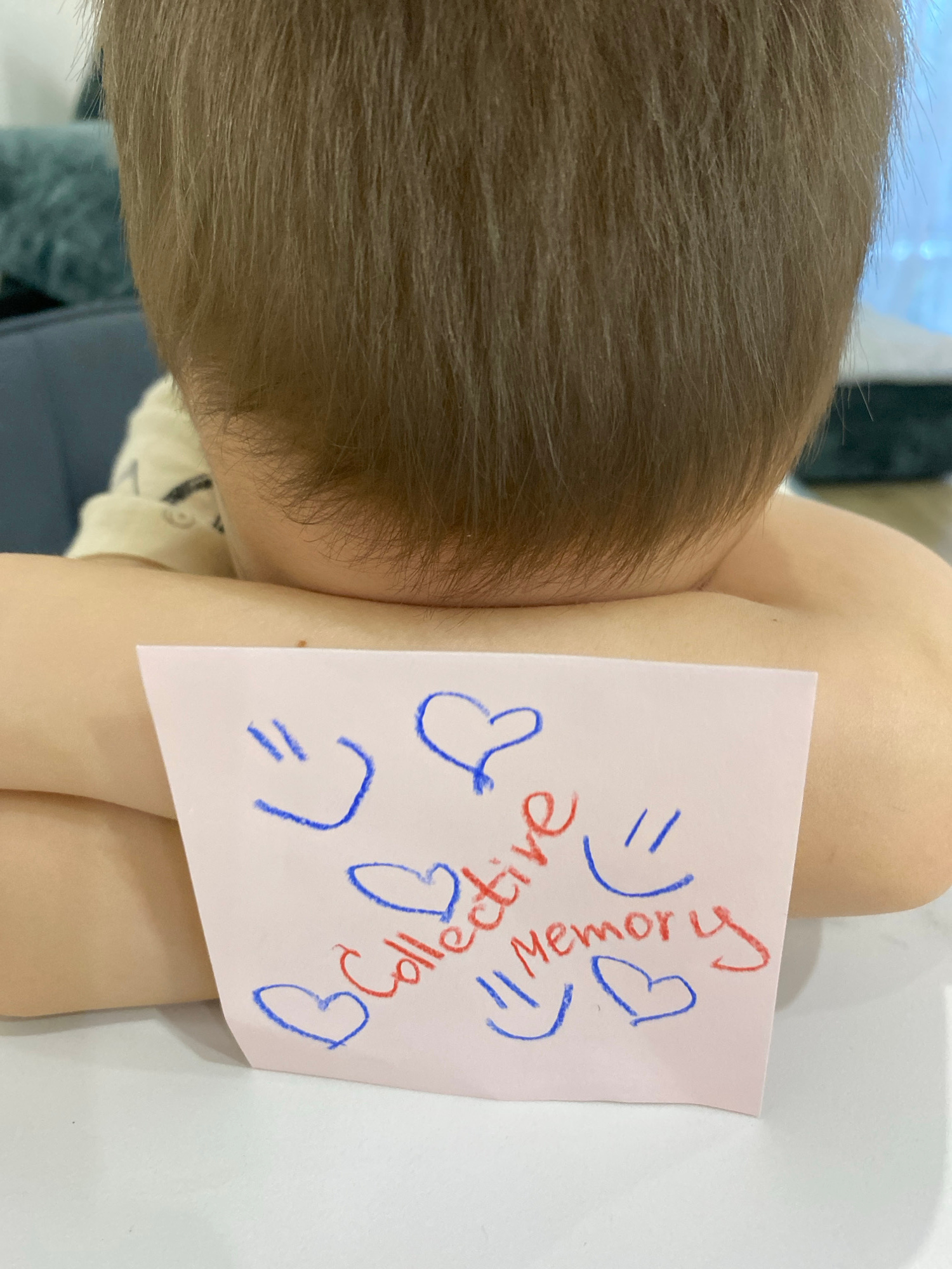 A child with short brown hair is holding a pink square of paper that is angled towards the camera. The paper has the words "Collective" and "Memory" written on it in red and blue ink, along with heart…read more