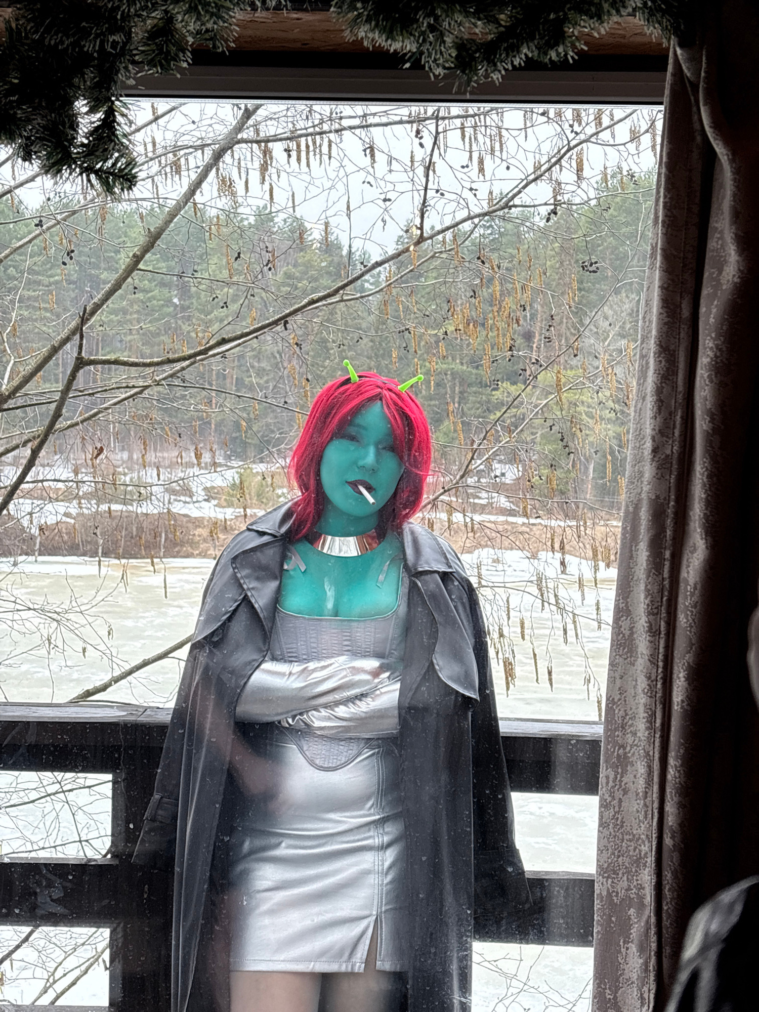 A vertically oriented shot shows a person with green skin, red hair, and antennae, wearing a silver outfit and black coat, looking out a window. The scene outside the window depicts bare trees and pos…read more