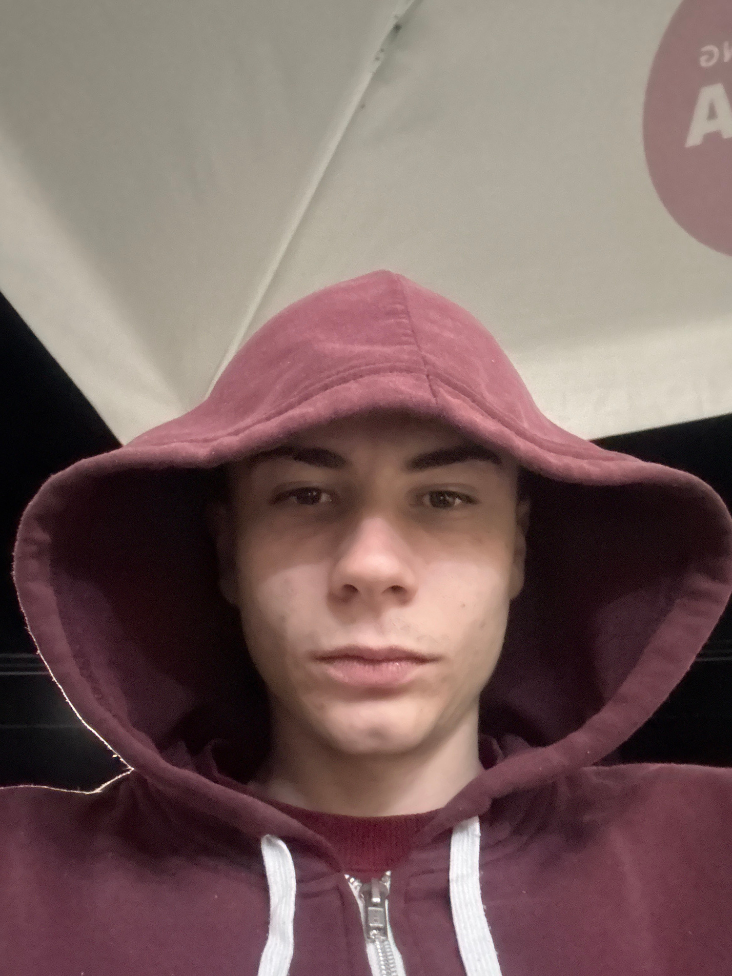 A young person with light skin, wearing a maroon hoodie with white drawstrings and a zipper, faces the camera. They are under a partially visible white surface with a red logo on the left side. The ba…read more