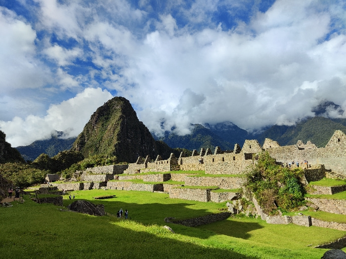This wide-angle photograph presents a panoramic view of the ancient Inca citadel of Machu Picchu in Peru, showcasing its iconic stone architecture and stunning natural surroundings. The scene is dominβ¦read more