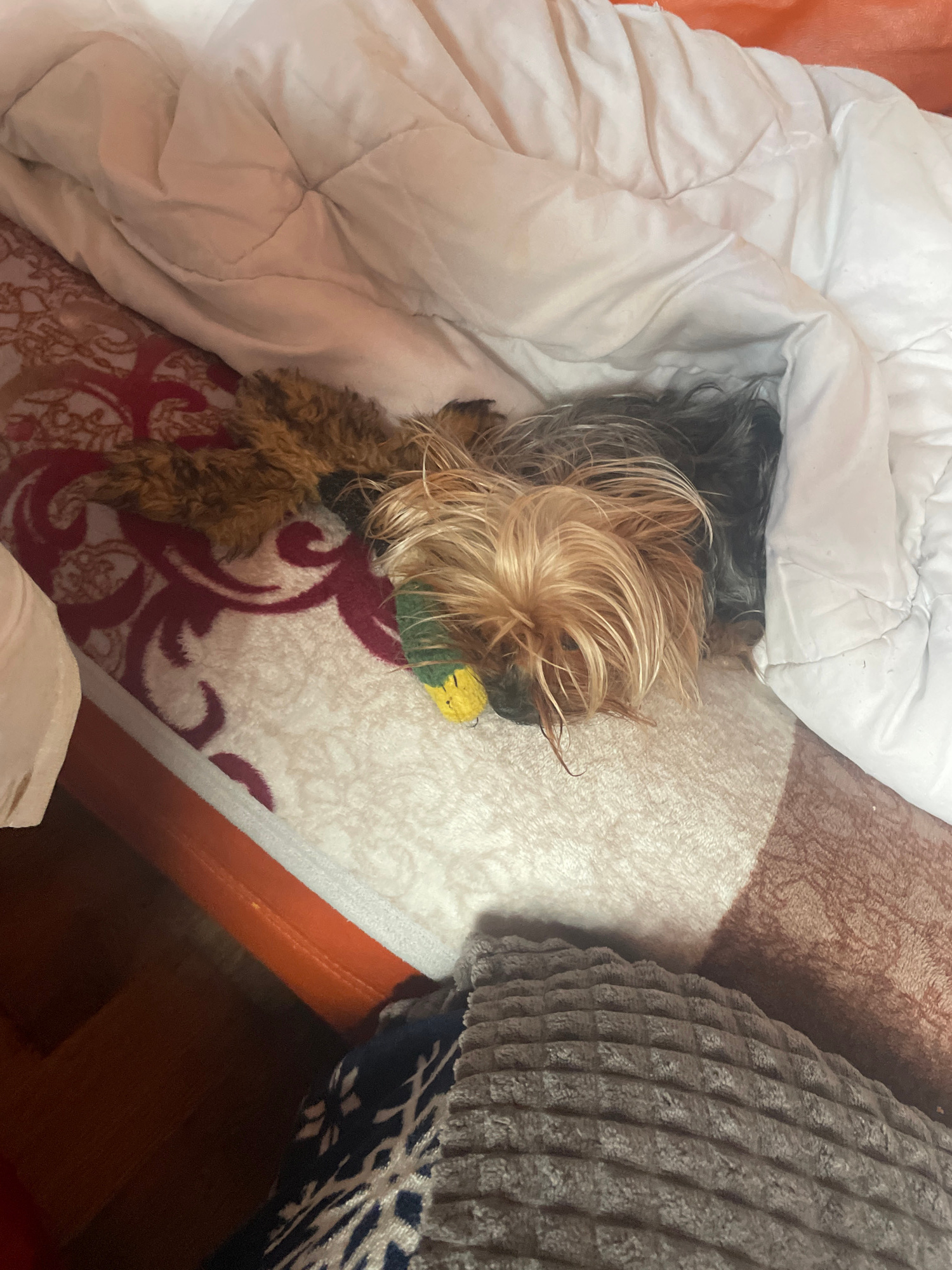 The image shows a small, long-haired dog, possibly a Yorkshire Terrier mix, partially covered by a white comforter. The dog is lying on a patterned blanket or bedding with red and white designs, posit…read more