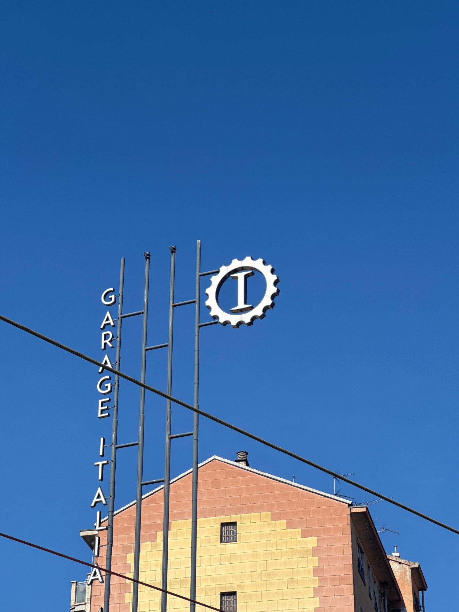 A low-angle shot reveals a sign reading "GARAGE ITALIA," topped with a gear-shaped logo containing a prominent "I." The sign is suspended in front of a building with a patterned facade of alternating…read more