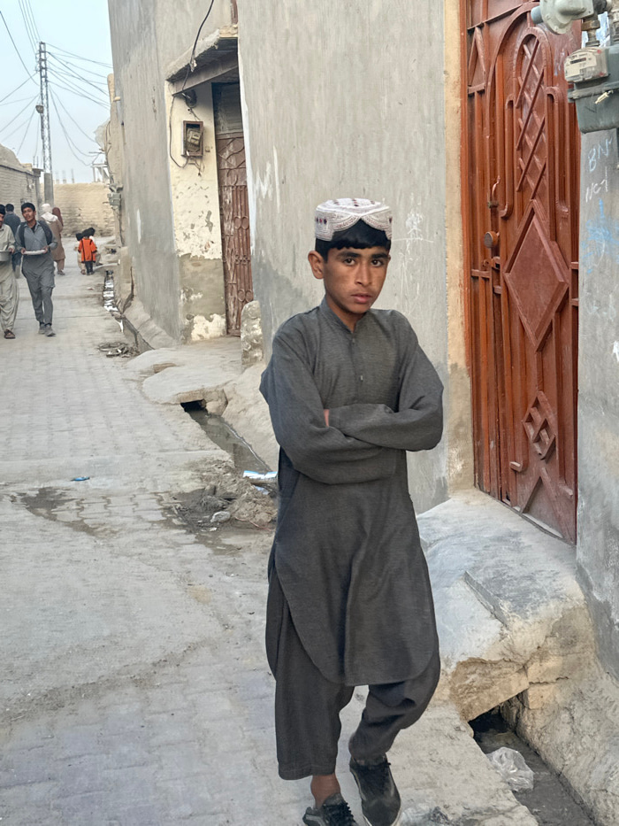 The image depicts a narrow, paved alleyway in Quetta City Tehsil, Pakistan, under daylight conditions. In the foreground, a male individual, appearing approximately 10-14 years old, stands with his ar…read more
