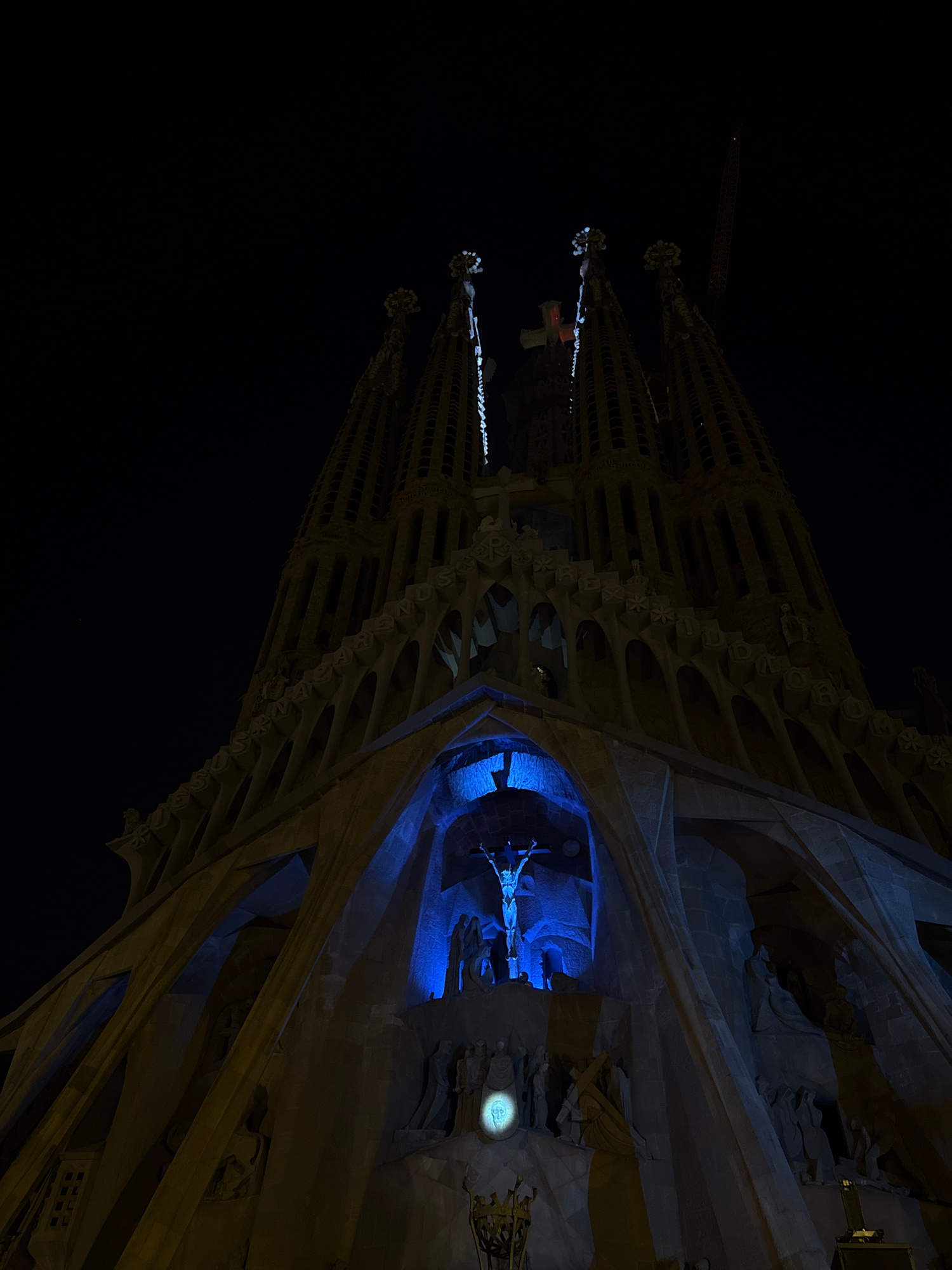 The image depicts the Sagrada Familia in Barcelona, Spain, at night. The cathedral's facade is illuminated with blue lighting, accentuating its architectural details. The structure exhibits ornate stoβ¦read more