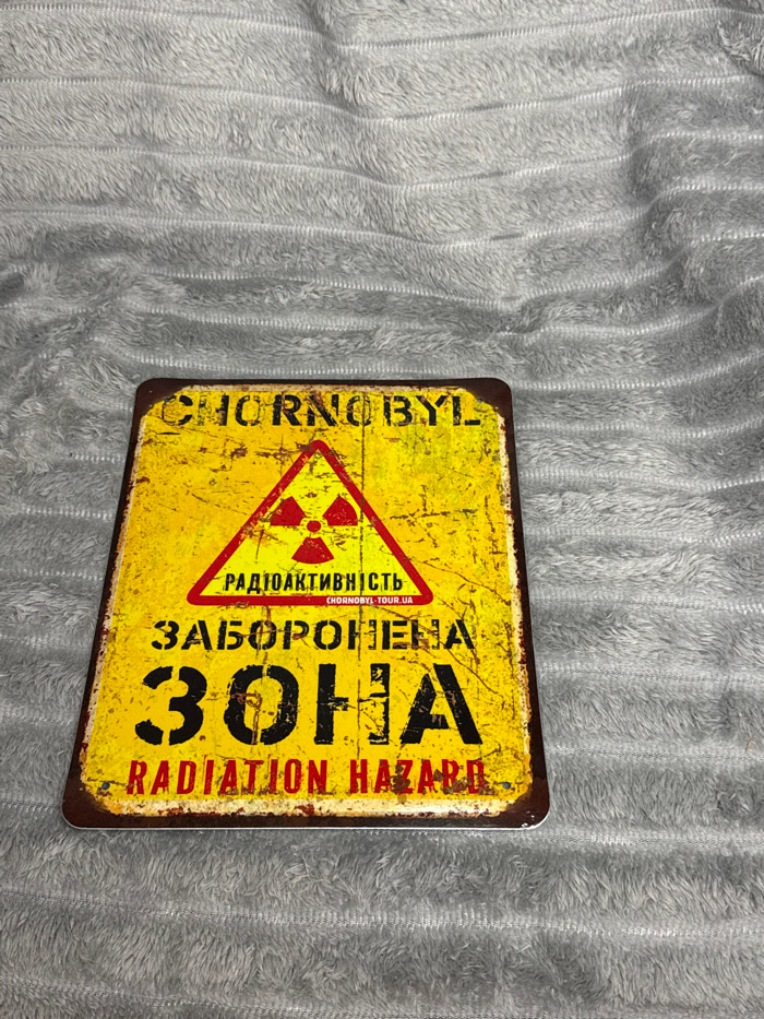 A rectangular, aged, yellow sign with a distressed finish lies on a soft, textured gray surface. The sign features the word "CHORNOBYL" vertically on the left. A red radiation hazard symbol sits above…read more