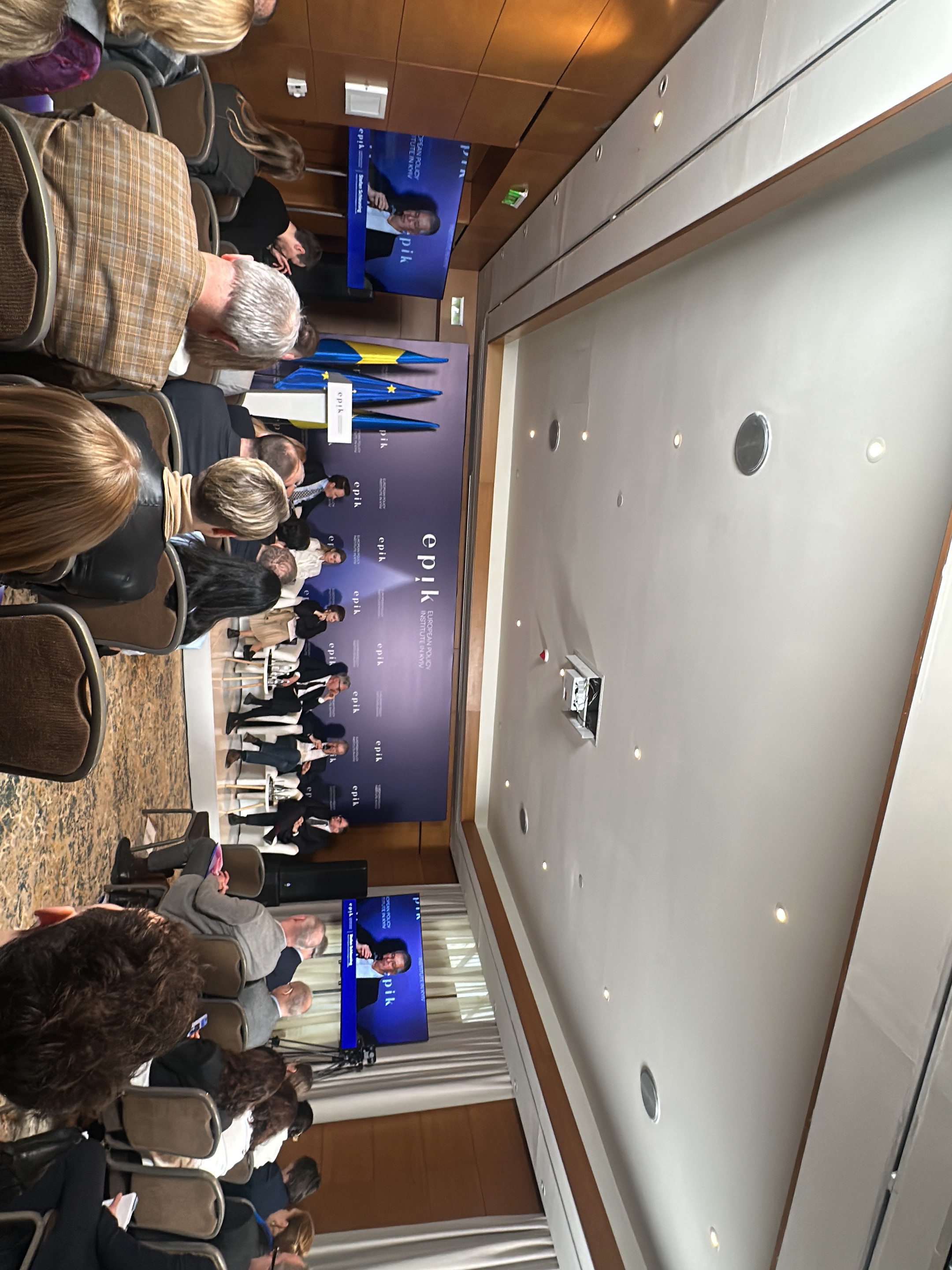 A medium shot of an indoor conference in Kyiv, Ukraine, with an assembled audience seated facing a raised platform with panelists. The wall behind the panelists is dark blue with the word “epik” in li…read more
