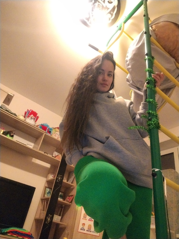 The image depicts an indoor residential scene in the city of Noviy, Russia. A female subject is prominently featured, positioned to the right of the frame, looking directly at the camera. She has longβ¦read more