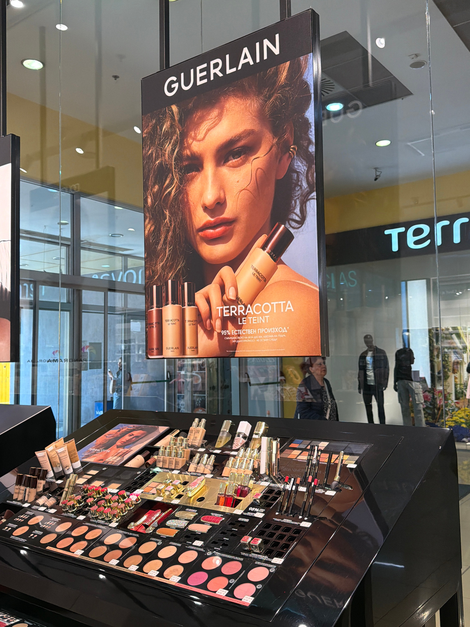 This media file presents a brightly lit cosmetics display within a retail environment in Pleven, Bulgaria. The central focus is a large promotional banner for Guerlain, showcasing their "Terracotta Le…read more