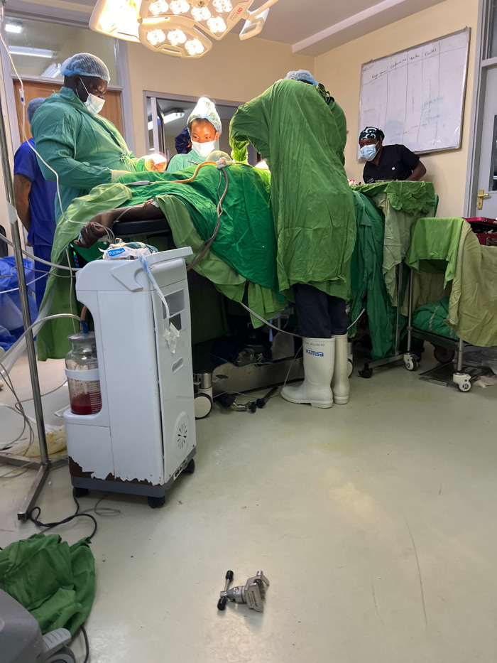 This image displays an active surgical procedure occurring within an operating room in Nairobi, Kenya. The location is identified by "KEMSA" branding on the white rubber boots worn by one of the medic…read more