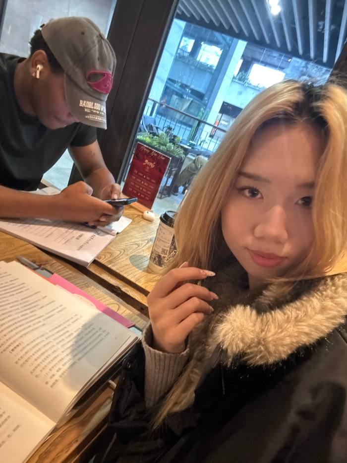 An indoor scene depicts two individuals seated at a wooden table within what appears to be a cafe or restaurant in Yuzhong District, China. In the foreground, a female of East Asian descent with long…read more