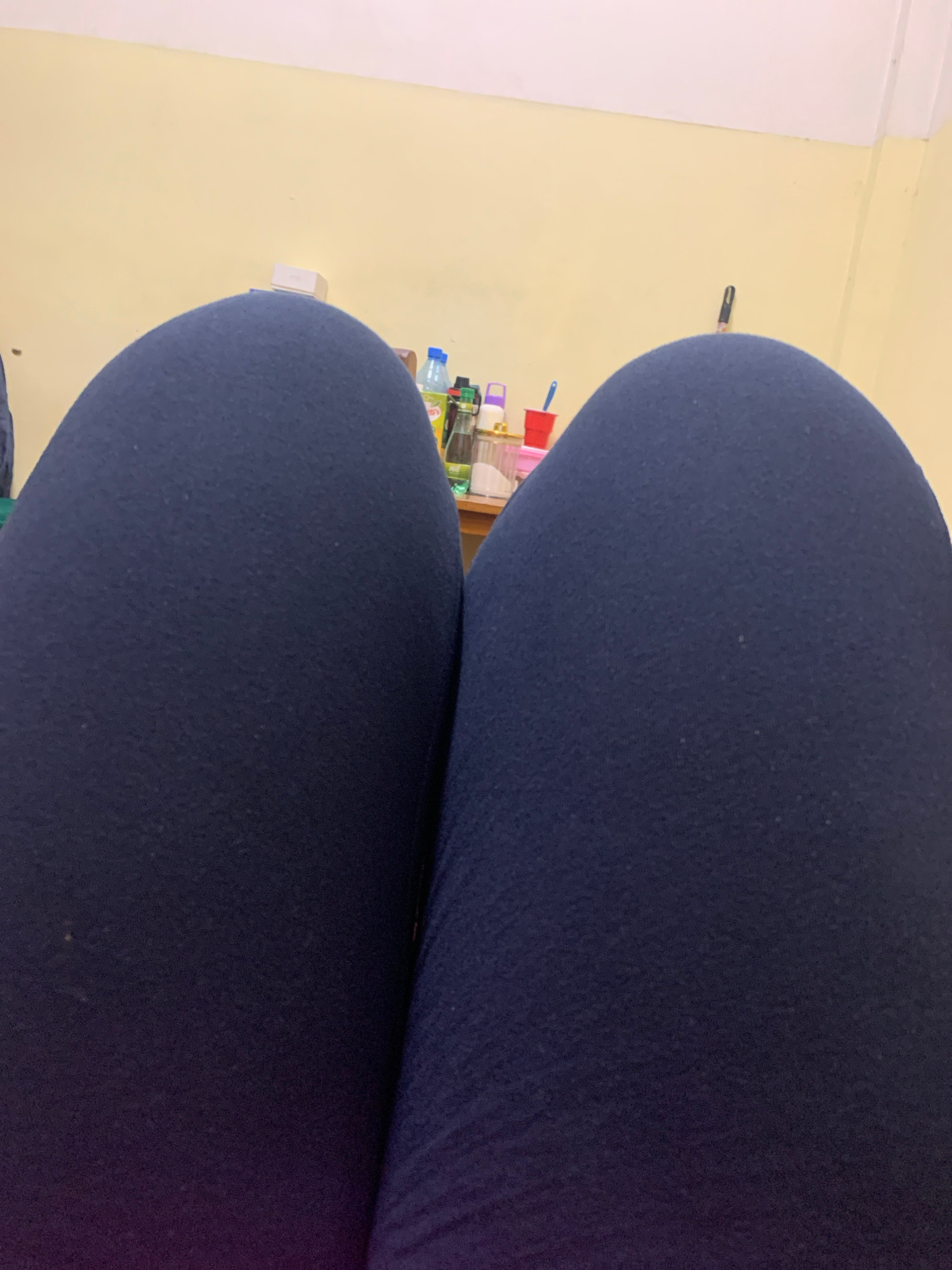 The image shows a close-up view of two legs covered in dark blue leggings. In the background, a yellow wall is visible, along with a shelf containing various bottles and containers. The setting appear…read more