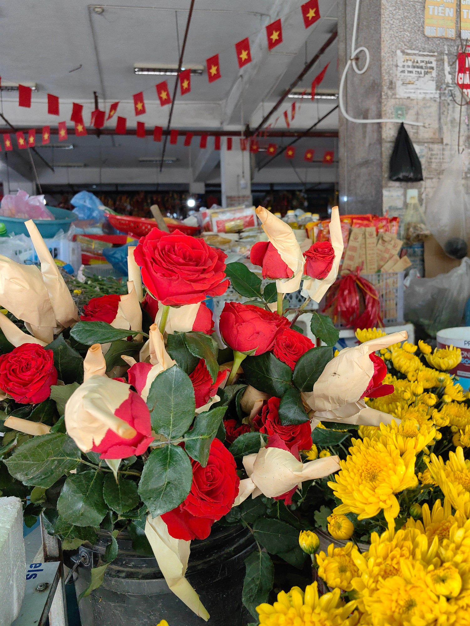 The image shows a flower market in Ha Long Ward, Vietnam, evidenced by the presence of Vietnamese flags hanging from the ceiling. A bucket containing red roses and yellow chrysanthemums dominates the…read more
