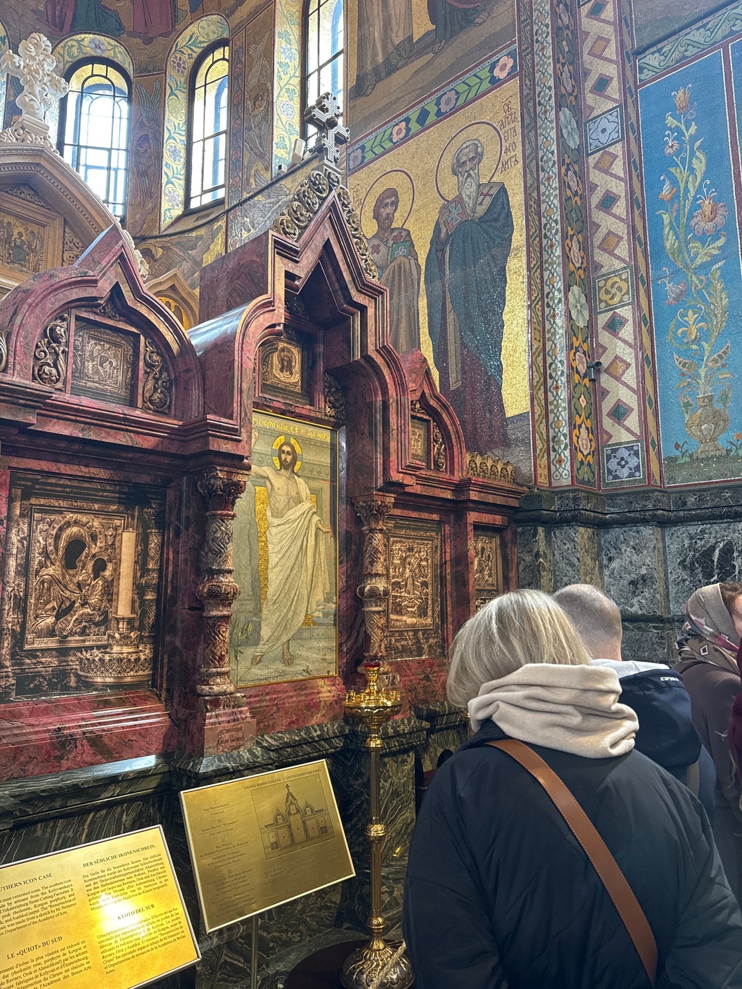 The image depicts the interior of the Church of the Savior on Spilled Blood in Saint Petersburg, Russia. The view is angled upwards, focusing on a portion of the elaborate marble and mosaic decoration…read more
