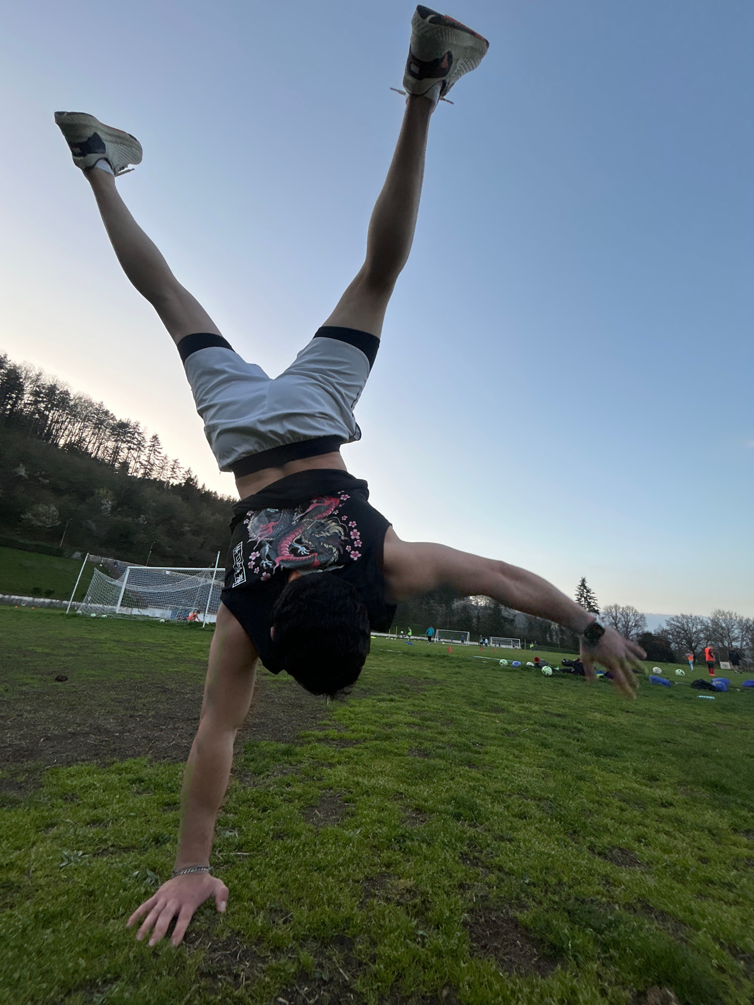 A male is captured in a dynamic handstand pose with legs extended wide apart in what appears to be an outdoor field possibly in Troyan, Bulgaria. The man wears a black t-shirt featuring an image of a…read more