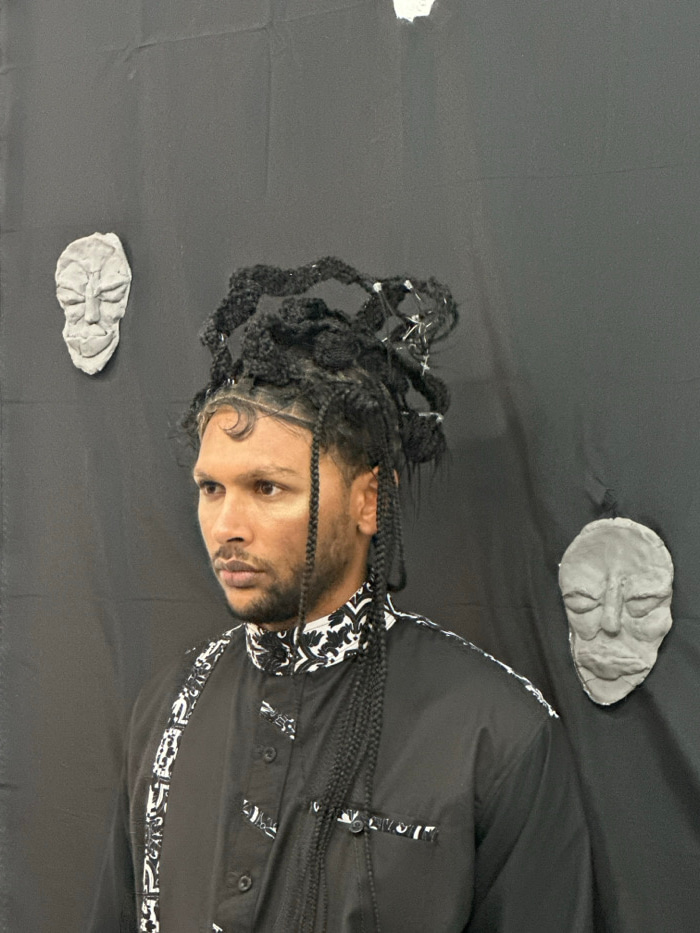 A man with dark skin, dark dreadlocks, and a beard is the central subject of this vertically oriented image. He wears a black collared shirt featuring intricate white patterns on the collar, down the…read more