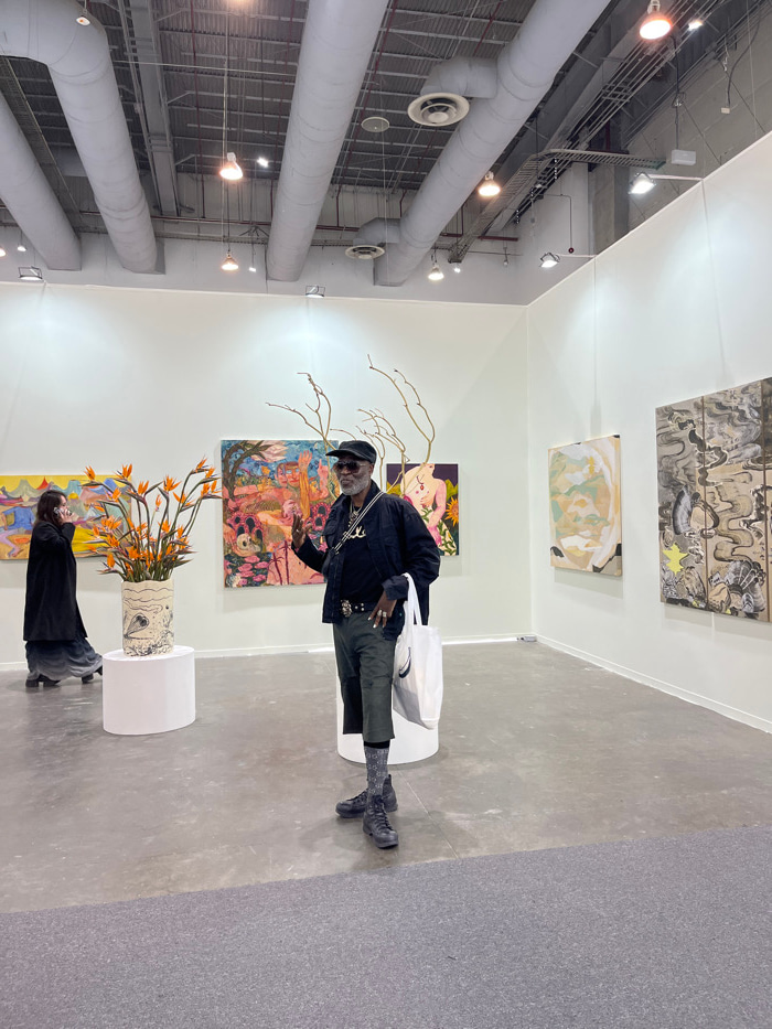 An art gallery displays vibrant paintings and a floral arrangement on white plinths. Overhead, exposed industrial piping and lighting fixtures create a modern atmosphere. A person in a black jacket, cā¦read more