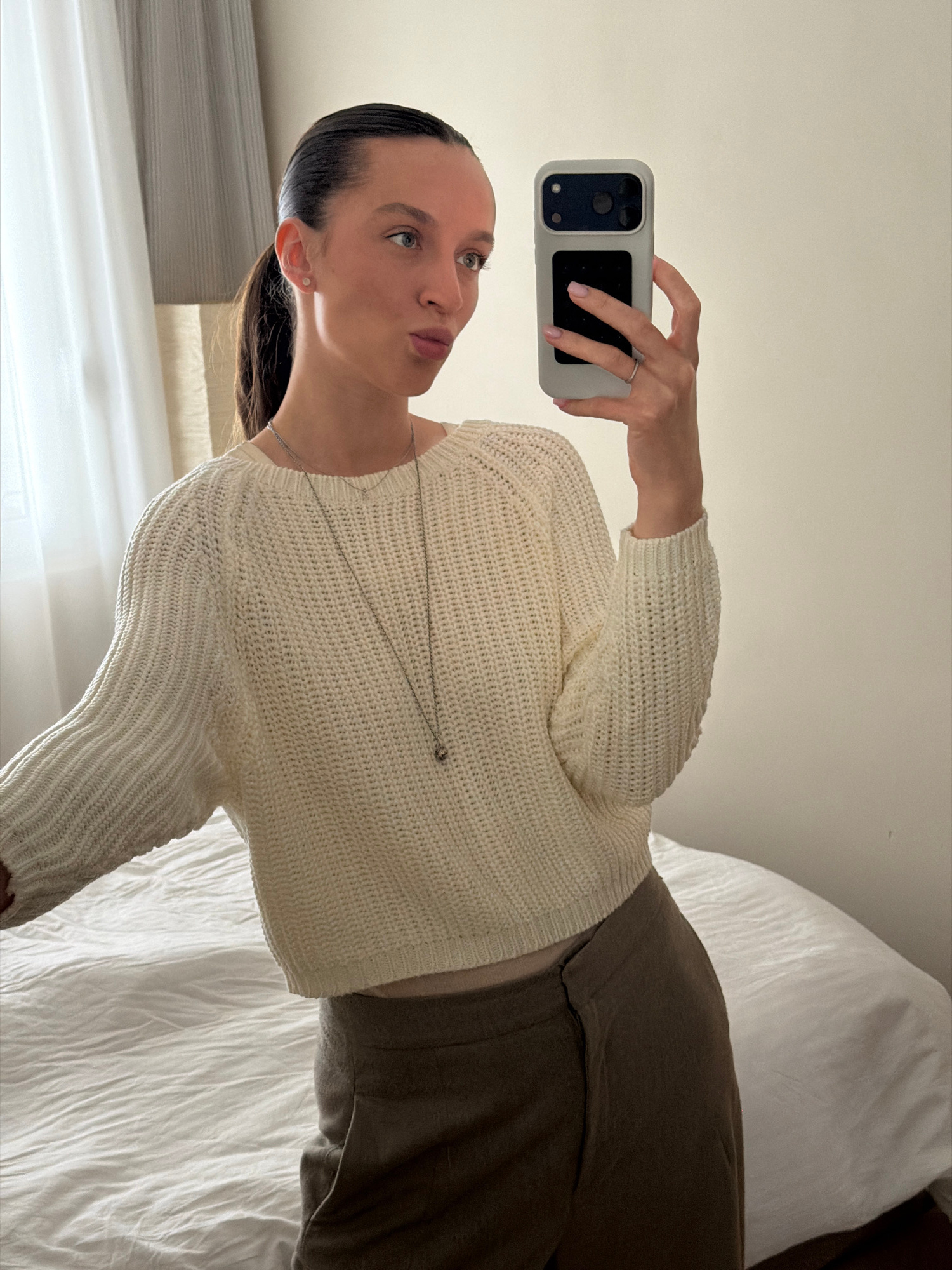 A woman is taking a selfie. She is wearing a cream-colored, knit sweater, olive green pants, and a silver necklace. She is holding a phone with a light gray case. She has dark hair pulled back and is…read more