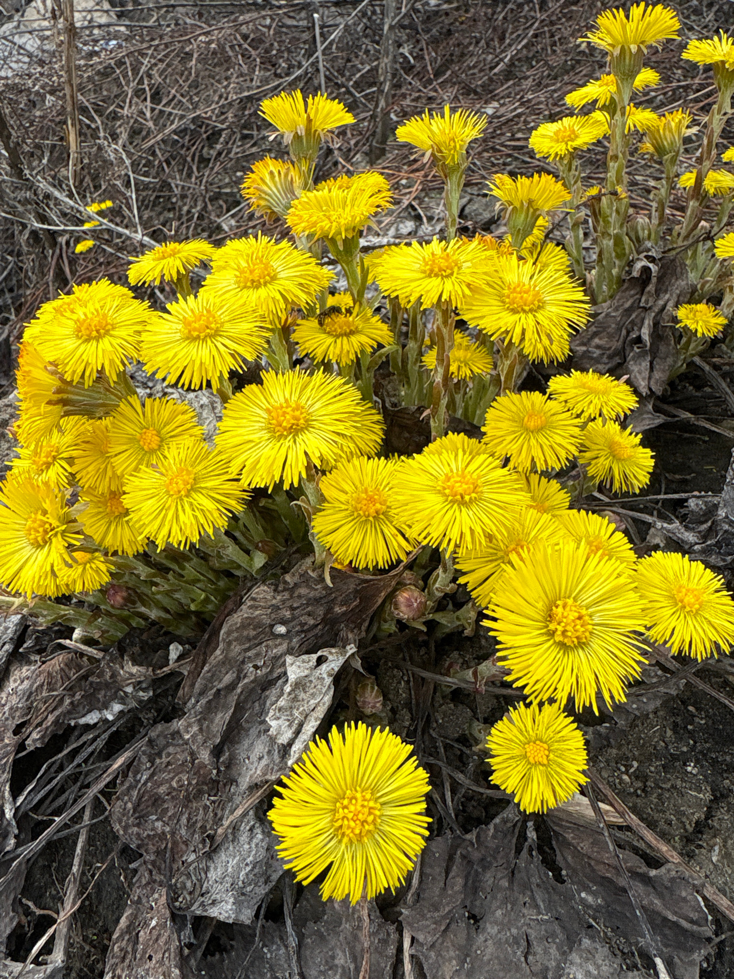 The image depicts a cluster of bright yellow Coltsfoot flowers (Tussilago farfara) growing in Ulyanovsk, Russia. They are clustered together amongst dead leaves, twigs and dry vegetation. The flowers…read more