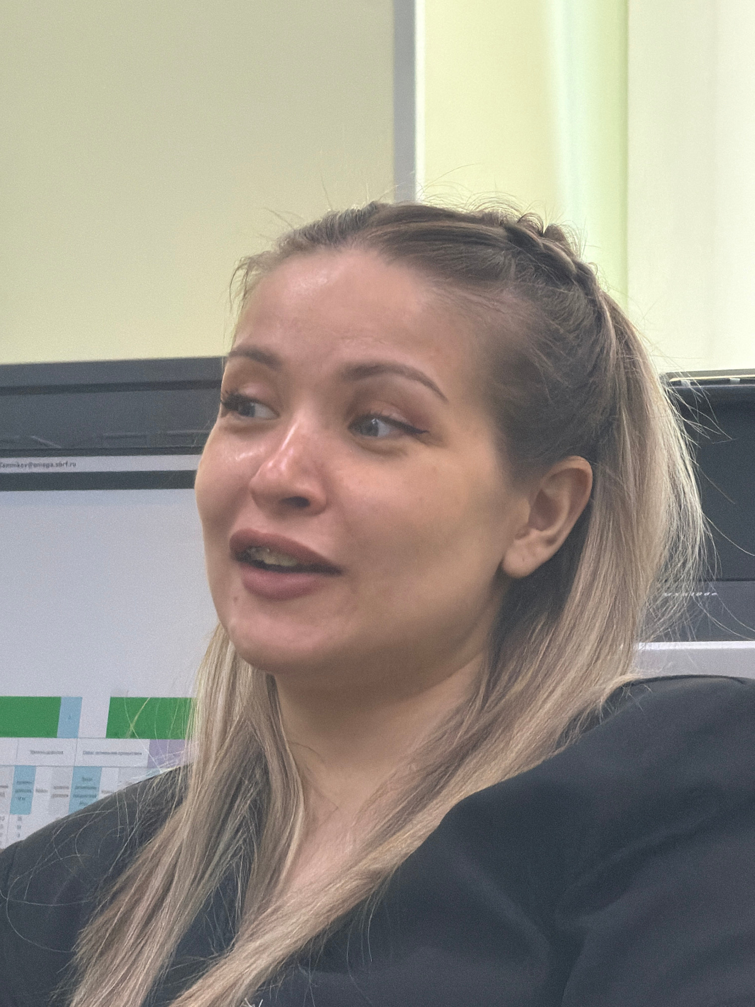 A fair-skinned young woman with blonde hair and a braided crown is the central figure. She is positioned in front of a whiteboard containing charts and text in Russian. She is wearing a dark-colored g…read more