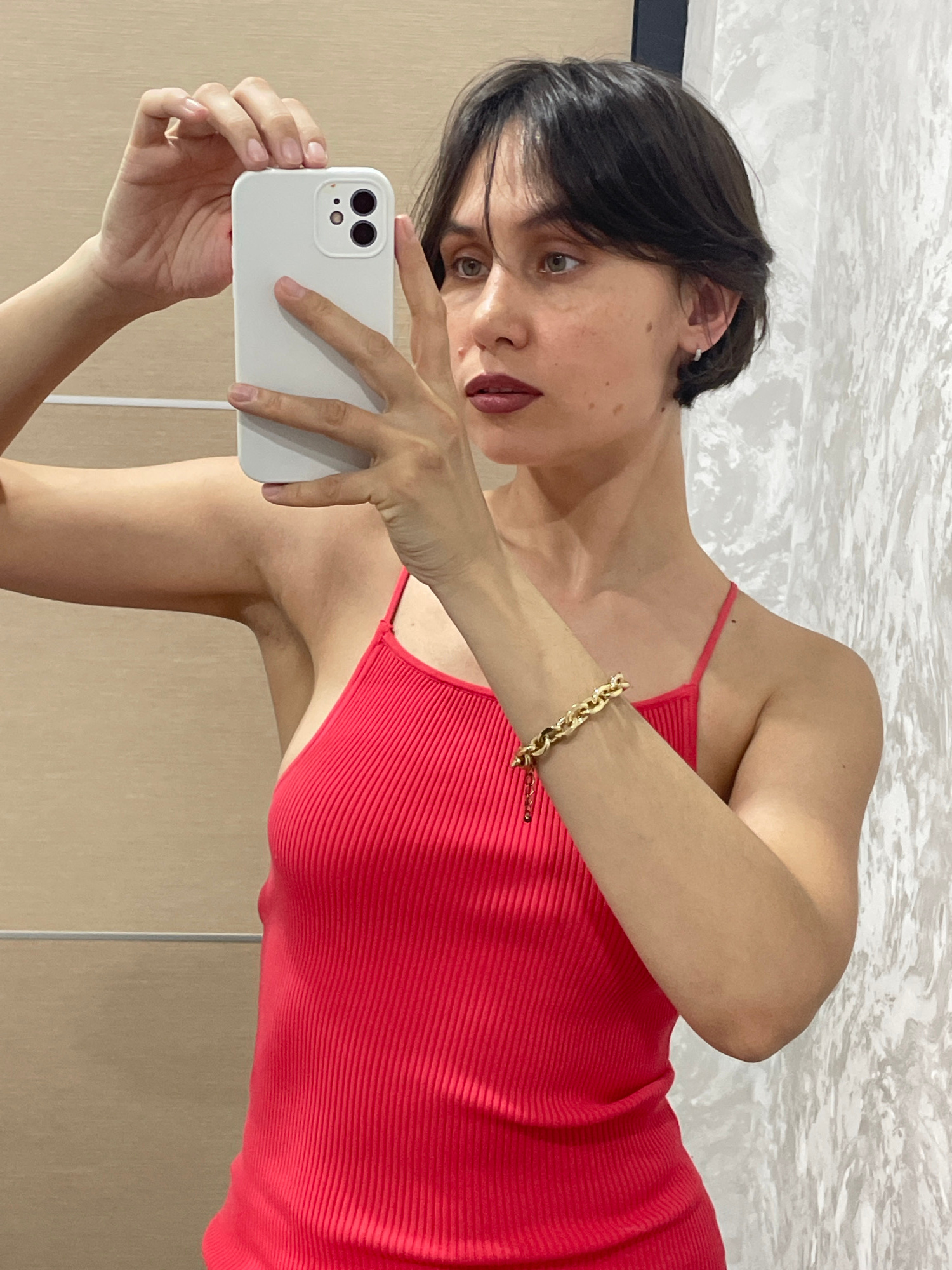 A woman with dark hair and brown eyes takes a selfie using a white smartphone. She is wearing a red ribbed top with thin straps and a gold bracelet on her left wrist. The background consists of a text…read more