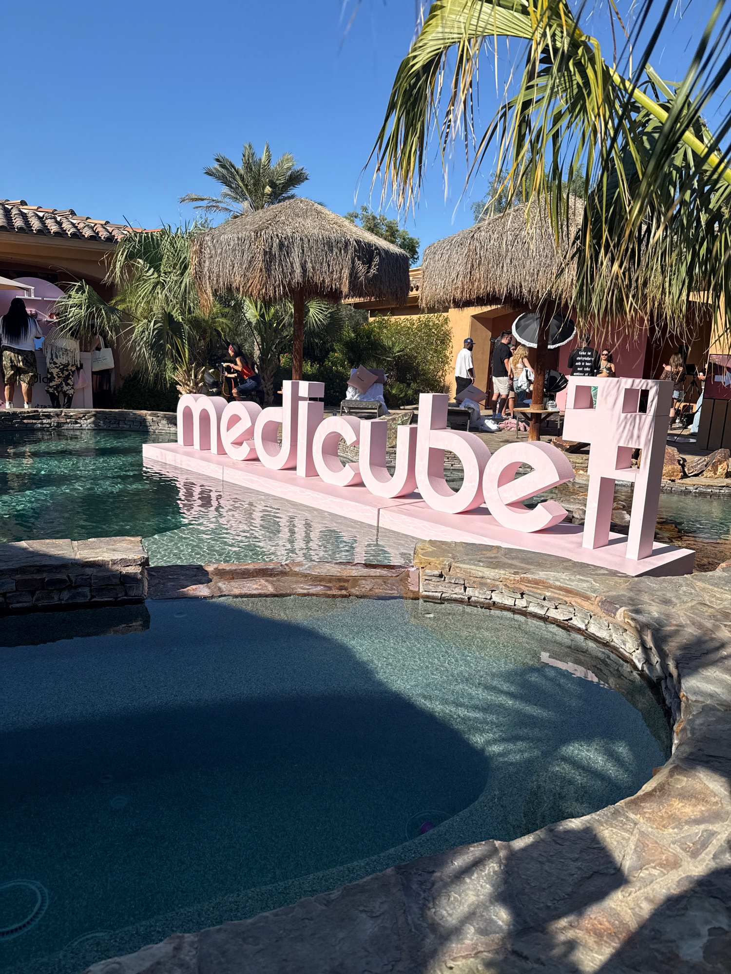 The image depicts an outdoor scene in Bermuda Dunes, United States of America. A pink "medicube" sign is positioned near a pool of water. People are visible in the background. Palm trees and thatched-…read more