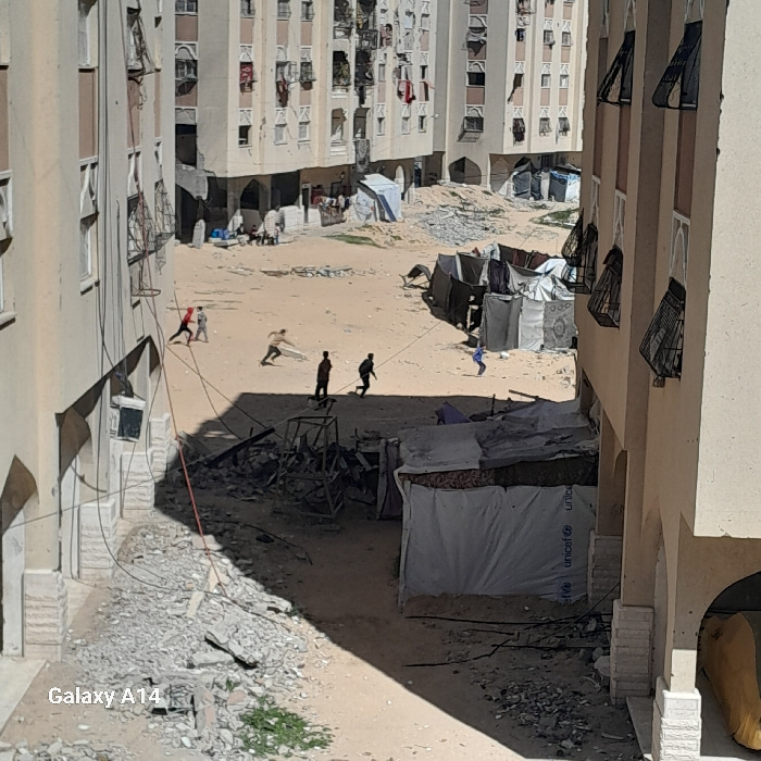 The image captures an outdoor scene in Khan Yunis, Palestinian Territory, centered on a large, unpaved dirt and sand area surrounded by multi-story residential buildings. These concrete structures exh…read more
